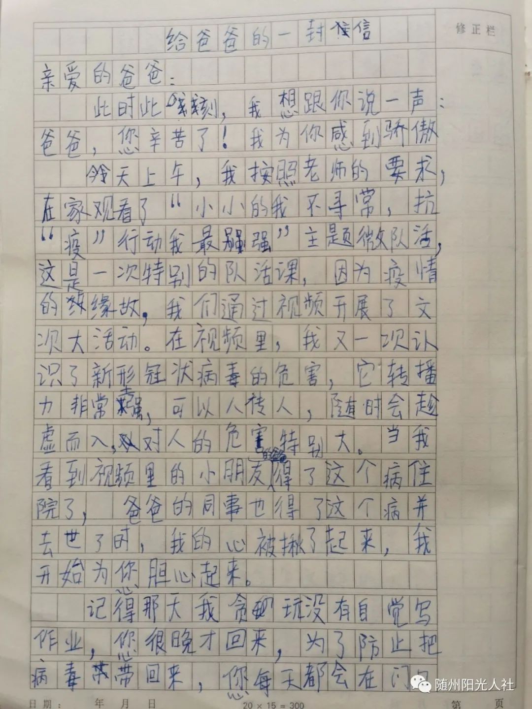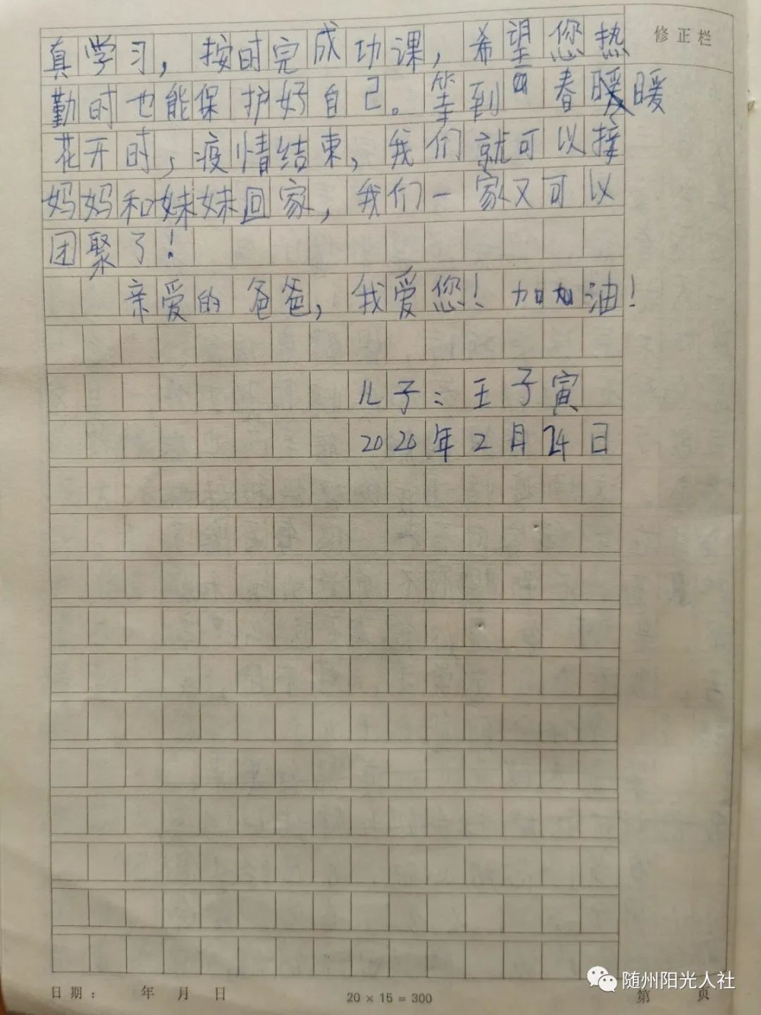 这是9岁儿子给在防疫一线爸爸的一封信