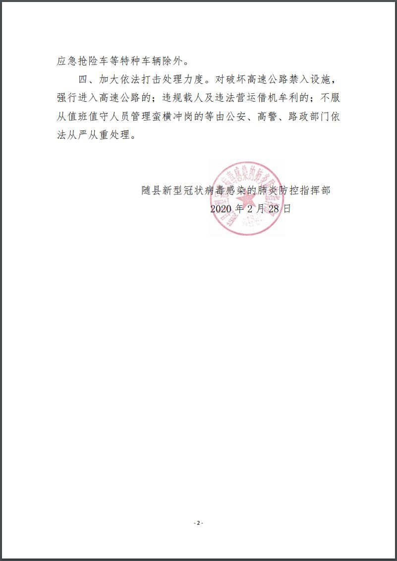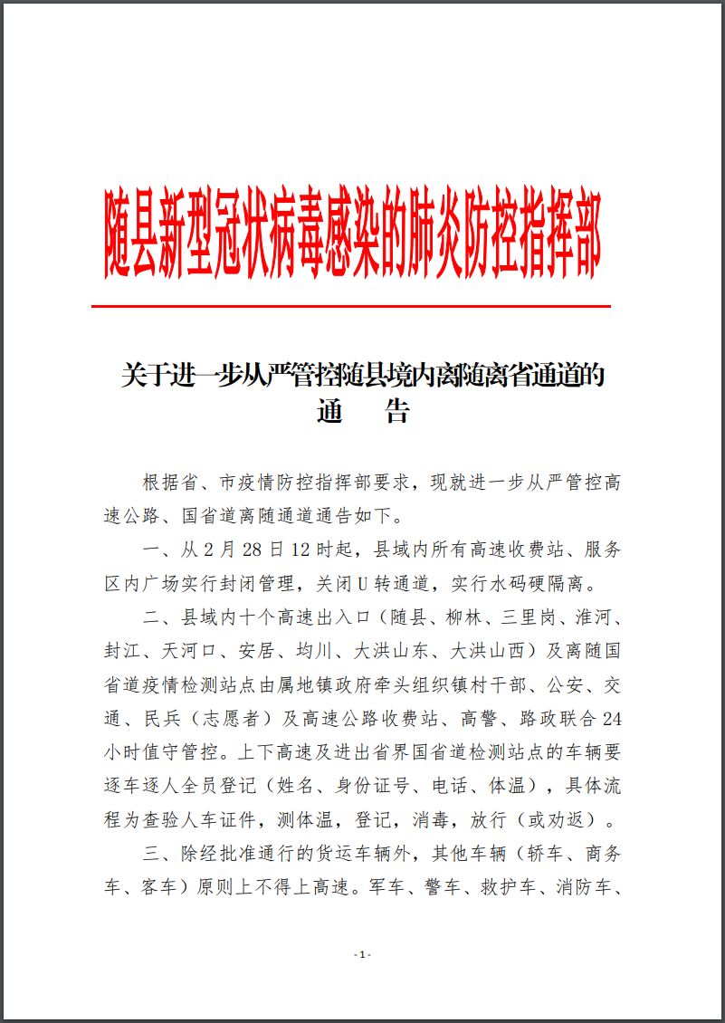 关于进一步从严管控随县境内离随离省通道的通告