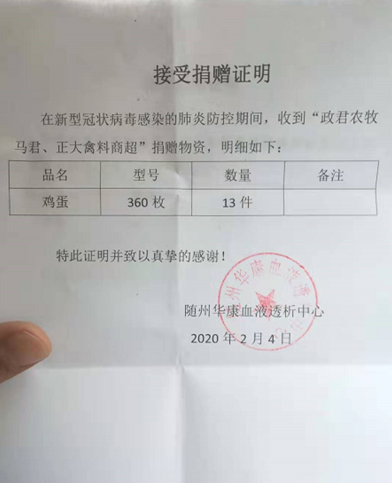 马君一直关注着随州市疫情的发展,先后向随州中心医院、曾都医院、华康血液透析中心捐赠了3万枚新鲜土鸡蛋,价值3万元。用实际行动为奋战在抗疫一线的医务人员加油鼓劲。同时,当他了解到因为疫情封路交通不便,导致很多养殖户的鸡蛋滞销,于是他挨家挨户到养殖户家中收购鸡蛋,从根本上解决了养殖户的销售困境。