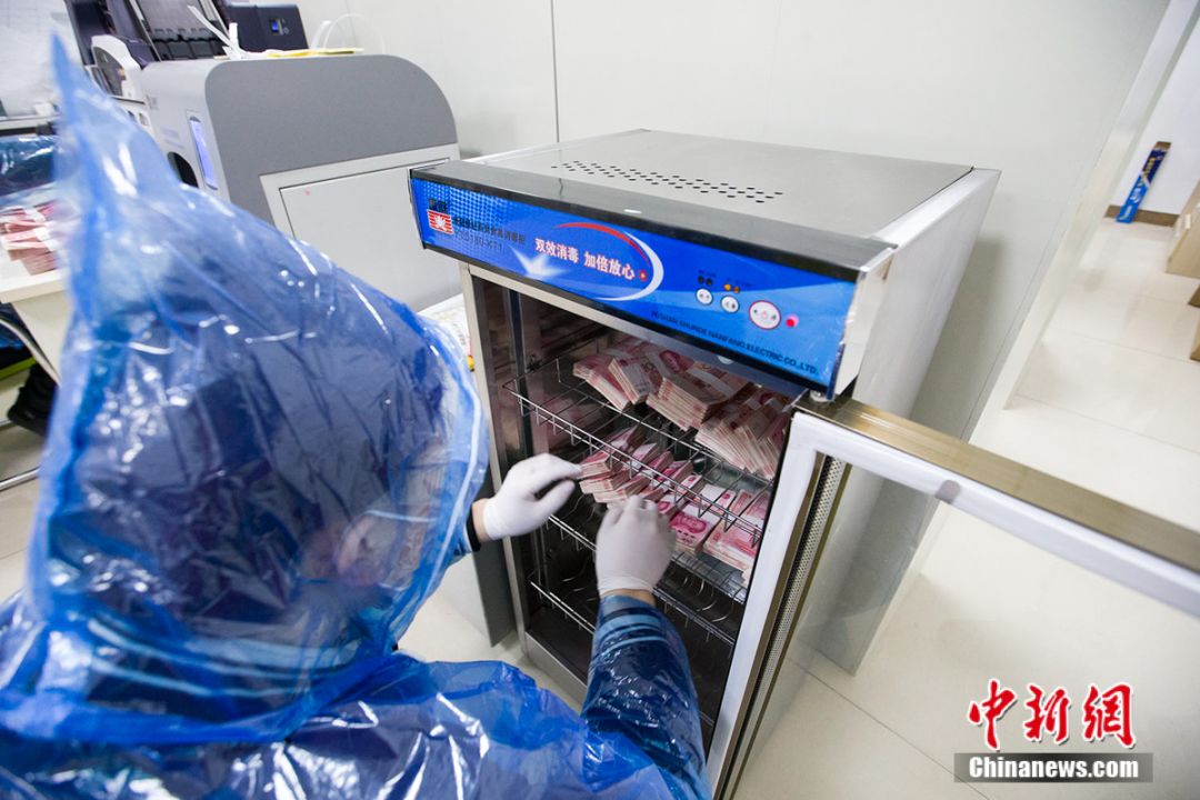 孔婧洁介绍,自1月29日接到相关通知起,营业网点开始现金消毒工作。“收回的现金,先以酒精擦拭消毒,晾干之后进行清点、清分、扎捆,捆好的现金装入专用袋,与人行提回来的原封券分开存放;再是将扎捆好的现金装入已进行消毒处理的款箱,统一安排放置指定地点(有条件的营业网点会将扎捆好的现金放入消毒柜,之后再统一装入款箱);最后上缴城区联社中心库,再由城区联社中心库进行紫外线等方式集中进行消毒处理。”