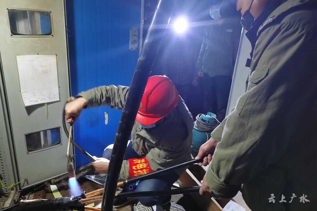 到了夜晚,抢修仍在应急灯的照射下紧张地进行着,现场施工人员共同扛起胳膊粗细的电缆,进行竖井内电缆的更换,制作电缆终端头,调整到合适位置,核准相序、安装线夹、紧固螺栓……此时大雨又一次袭来,小区居民给抢修人员送来雨伞,搭建遮雨棚。