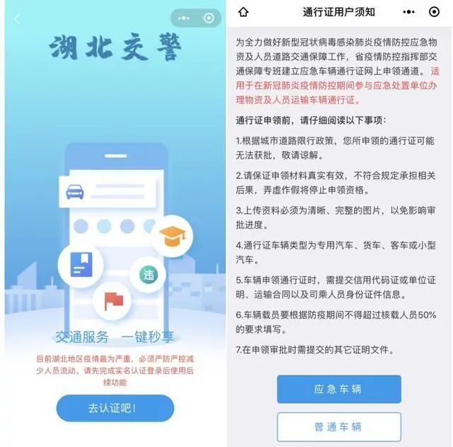 参与疫情防控的相关单位依托“湖北交警”微信公众号,凭验证码口令在线申领。省、市(州)、县(市、区)三级疫情防控指挥部相关工作组(专班)负责后台审核,应急保障车辆和人员信息通过审核确认后,由交通保障专班依规审批,并生成电子通行证(含二维码)下发至申领人微信端。路面防控人员通过扫码对通行车辆和人员进行查验,各级疫情防控指挥部审核审批的电子通行证或纸质通行证在全省范围内有效。