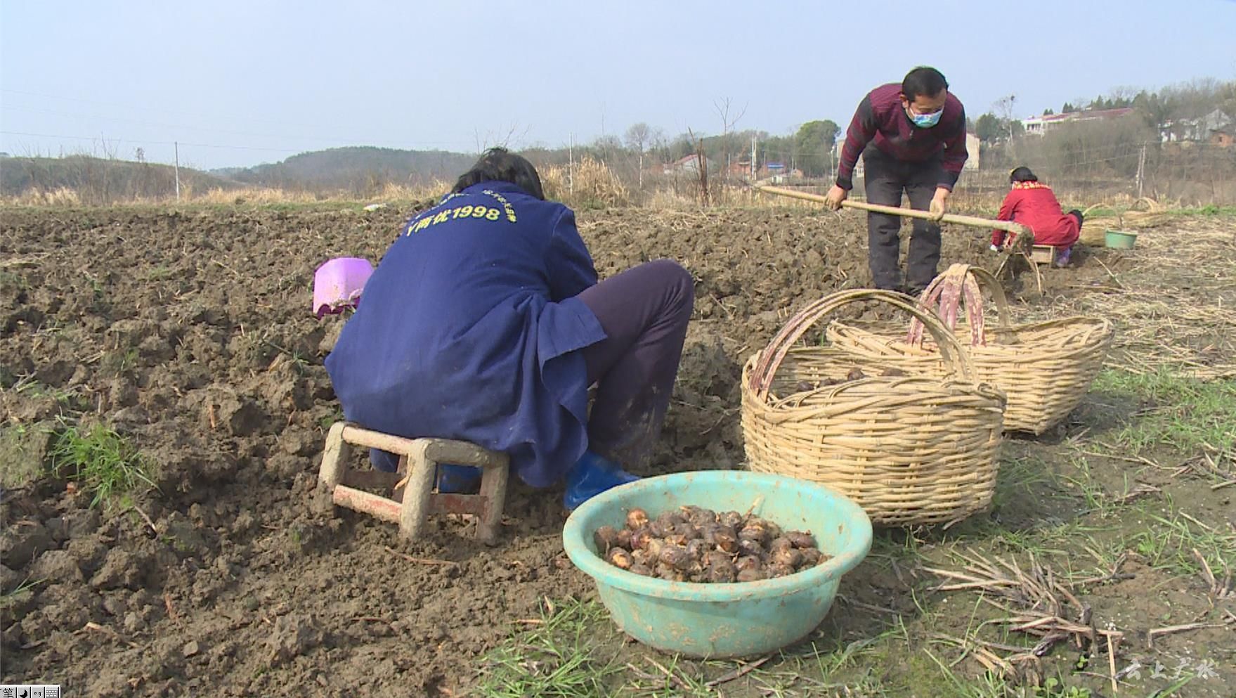 3月1号,在广水市关庙镇四畈村的400亩荸荠生产基地,村里的贫困户由村支部统一组织,正散布在田地里,刨出泥土中的荸荠,这是镇政府为帮助该村贫困户今年一起脱贫,投入10万元扶贫资金建立的脱贫产业项目。