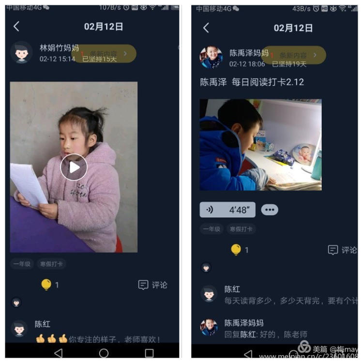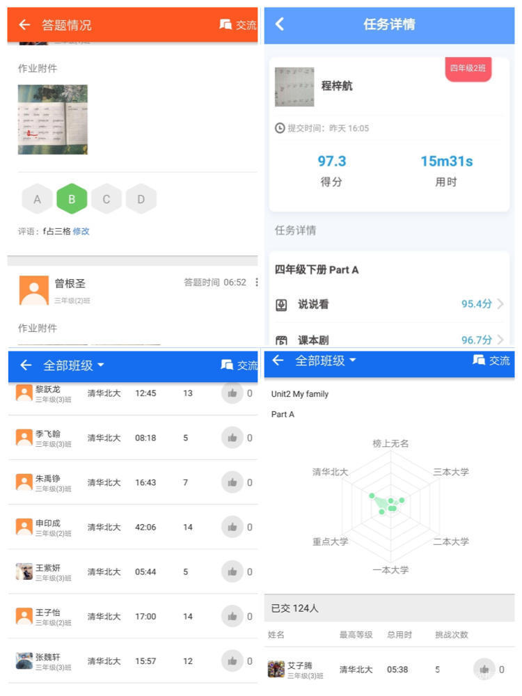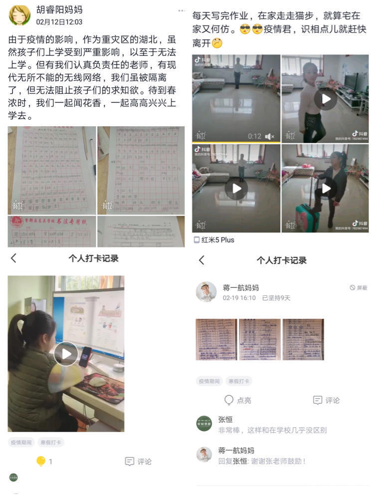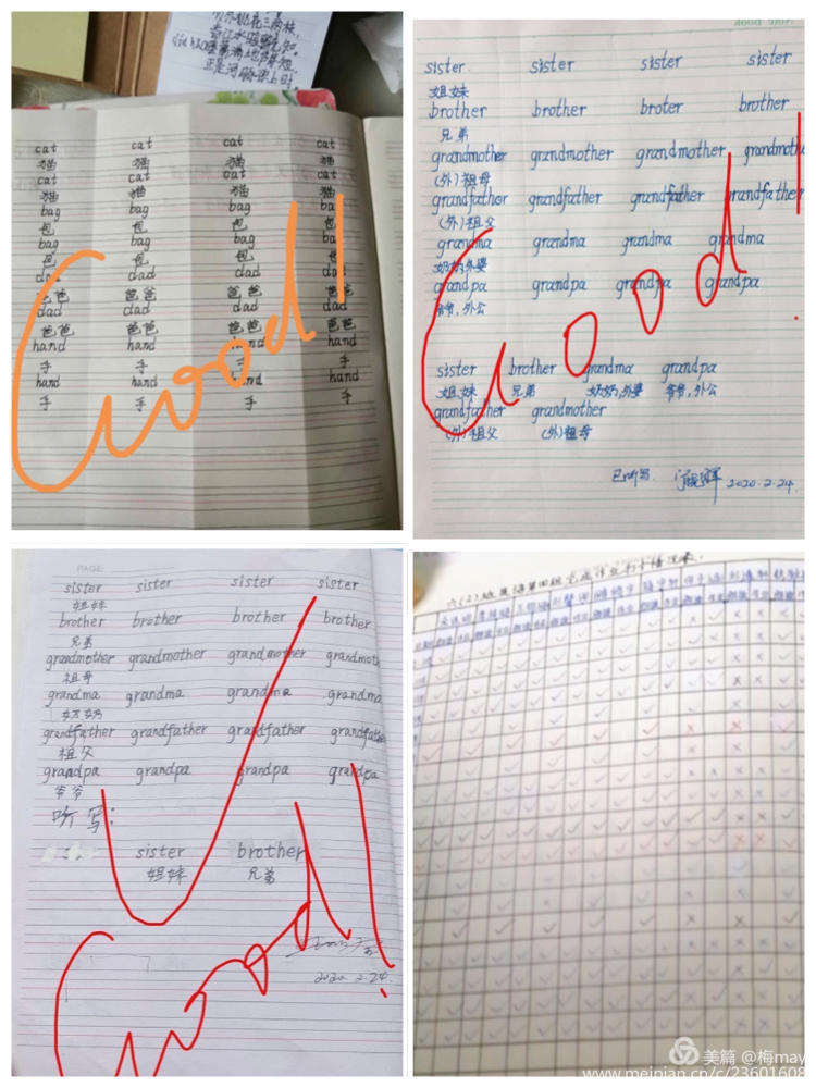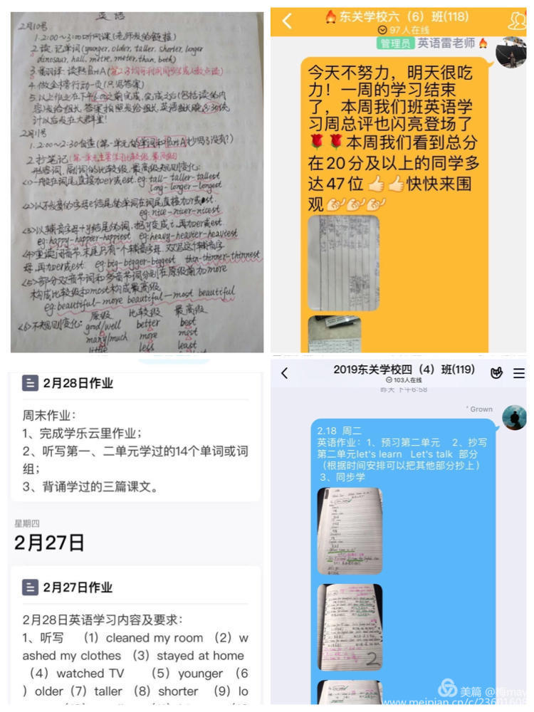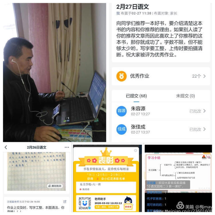 虽然是隔空的网络教学,但是通过布置作业、改作业依然能掌握学生的学习情况:语文教学,阅读、认字、写作等跟线下课堂一样,一点都不马虎;数学教学,老师们通过线上课堂抢答、堂堂清以及课后限定时间测验等,让学生对每一个知识点都掌握熟练和透彻;英语教学从单词、词组、句子、语法、阅读等各个方面,落实检查到位,老师们的敬业精神真是好样的。