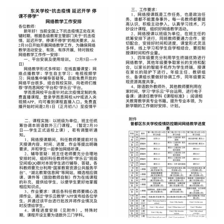 根据各级教育主管部门关于“抗击疫情,延迟开学,停课不停学”的相关要求,从2月10日开始开展网络教学工作,为确保网络教学活动安全、有效、有序开展,制定东关学校在疫情防控期间开展网络教学的实施方案。