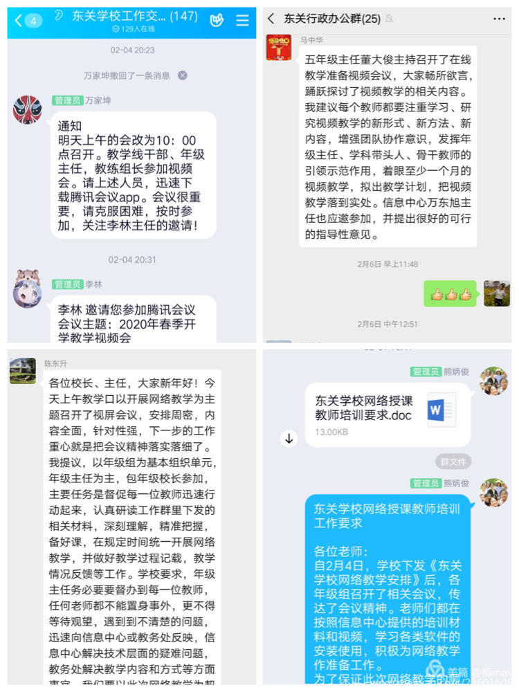 本次网络授课活动学校高度重视,成立以校长陈东升同志任组长,分管教学的副校长熊炳俊同志任副组长,教务处主任、信息管理中心主任、年级主任和教研组长为成员的网络教学管理专班。网络教学工作由教学线牵头,其他线配合,教务处负责宣传动员、计划安排、统筹协调、检查督促,信息管理中心负责教师及家长培训、技术指导、信息收发、资源调配,确保网络教学活动安全、有序、减负、高效。
