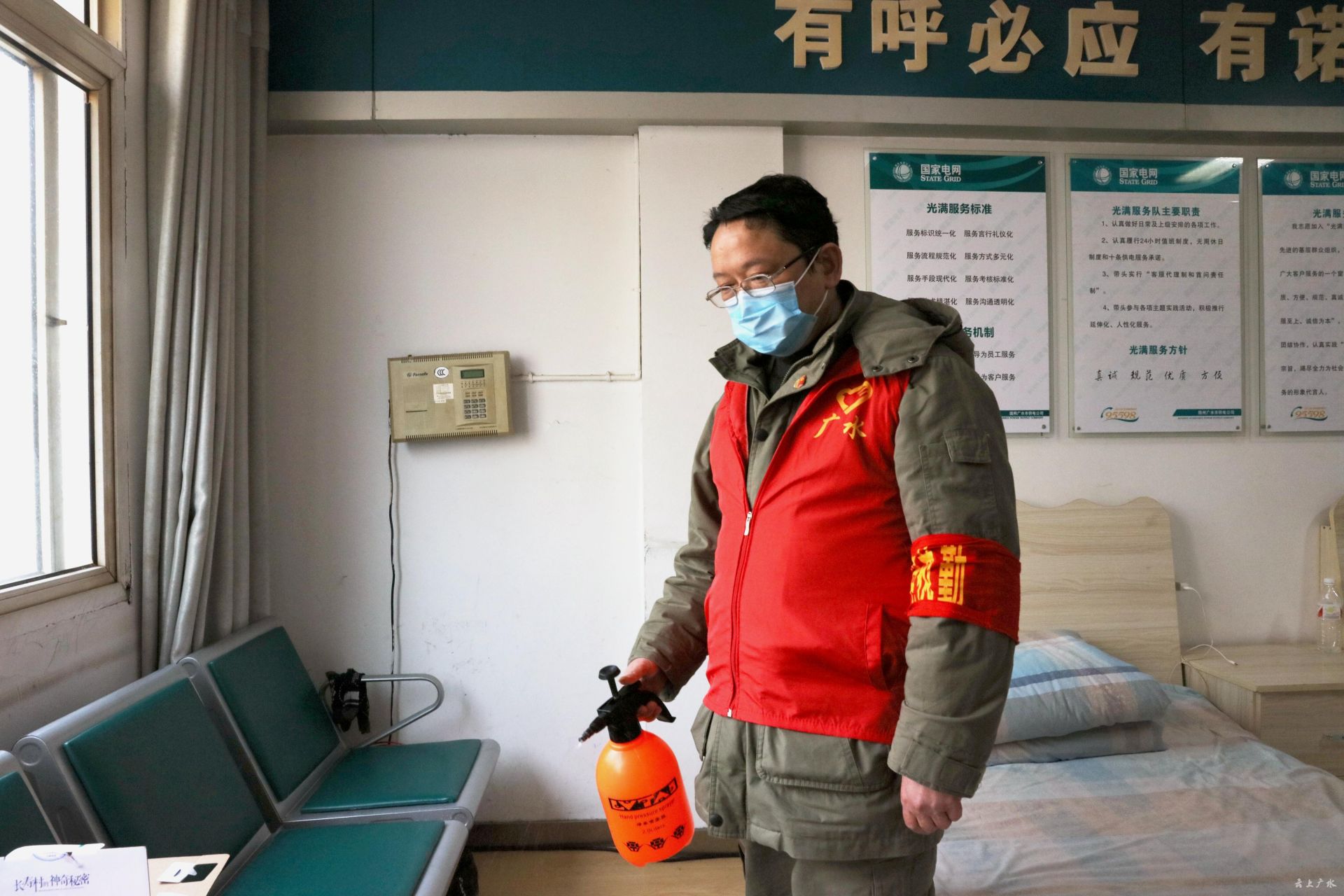 每天早上7点半,张静东准时到达供电所,开始对供电所值班室、办公室等场所进行消毒,并逐一为进出人员测量体温,配备手套、消毒洗手液等防护用品,为员工自身防护提供切实保障。