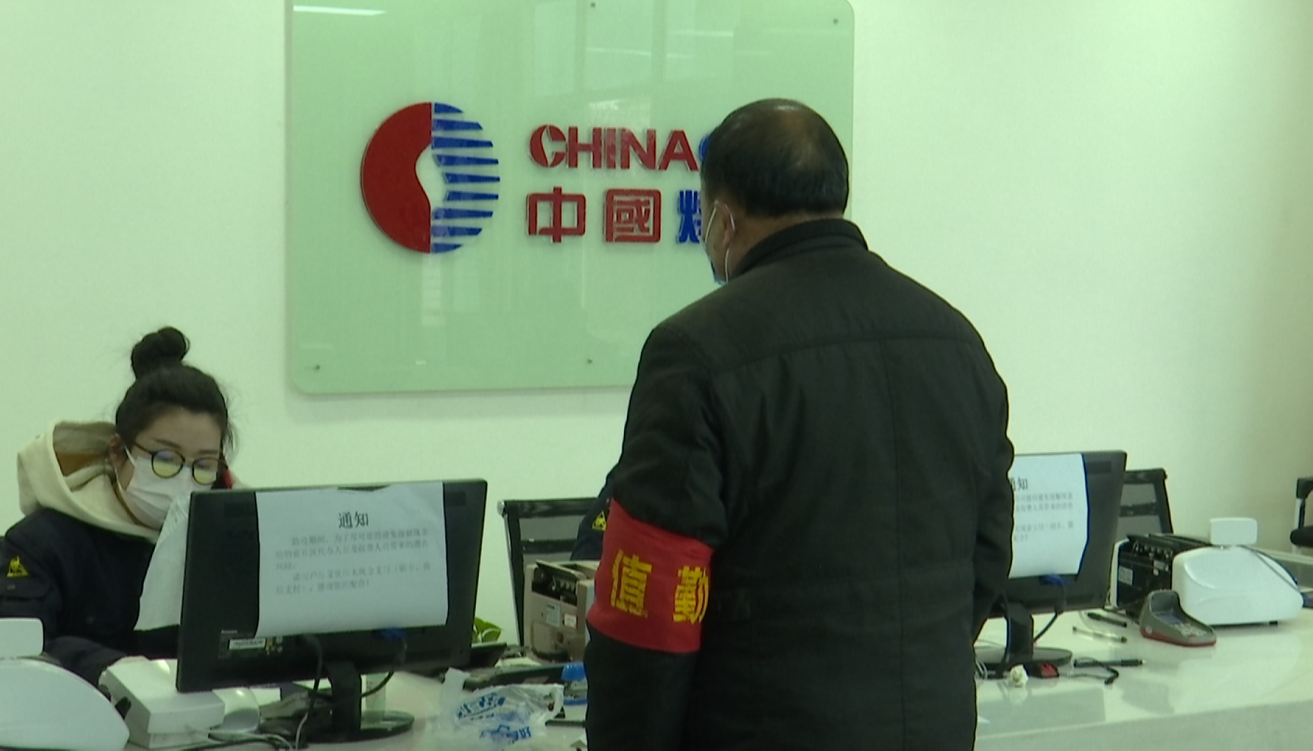 在沿河大道的中燃业务办理大厅,做好防护措施的工作人员正在给前来代办充值业务的人员测温登记。