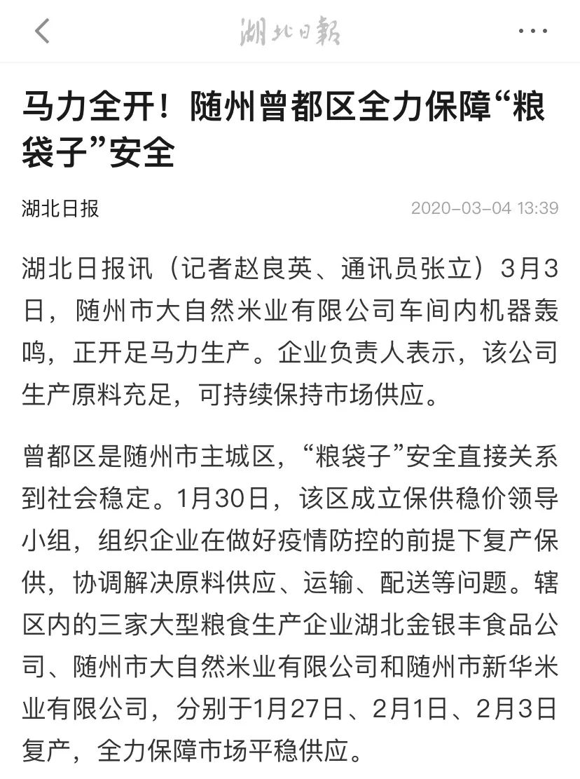 曾都区是随州市主城区,“粮袋子”安全直接关系到社会稳定。1月30日,该区成立保供稳价领导小组,组织企业在做好疫情防控的前提下复产保供,协调解决原料供应、运输、配送等问题。辖区内的三家大型粮食生产企业湖北金银丰食品公司、随州市大自然米业有限公司和随州市新华米业有限公司,分别于1月27日、2月1日、2月3日复产,全力保障市场平稳供应。