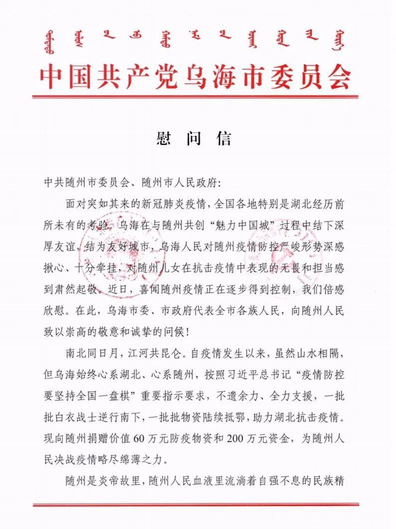 我们坚信,有乌海人民对随州疫情的挂念和支持,随州定能在这场疫情防控阻击战中取得胜利!随州也始终与乌海心手相连、守望相助、并肩作战。