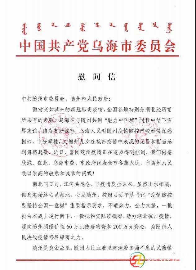 当日,乌海市委市政府在写给随州市的慰问信中说:“乌海人民对随州疫情防控严峻形势深感揪心、十分牵挂,对随州儿女在抗击疫情中表现的无畏和担当肃然起敬……乌海将始终与随州并肩作战!”