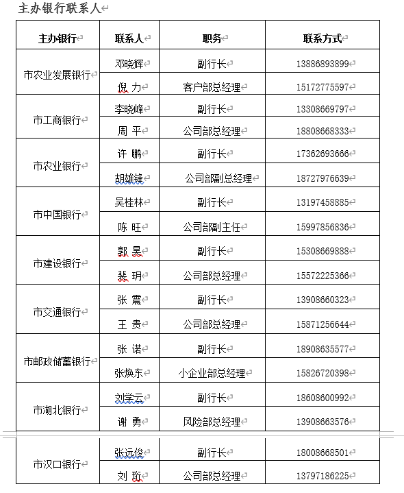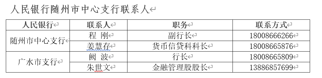 为便于相关企业进行咨询,现将人民银行随州市中心支行及各主办银行的联系人员、联系方式公布如下: