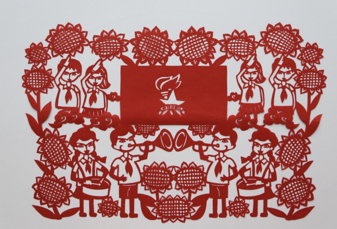 作品的中心是队旗,上面有星星火炬的标志。下方是湖北省少先队员卡通形象菁菁和楚楚,吹响了号角,上方是代表江西省少先队员。党是太阳我是花,采用了向日葵花,表现少先队员是党领导的队伍,红领巾心向党。