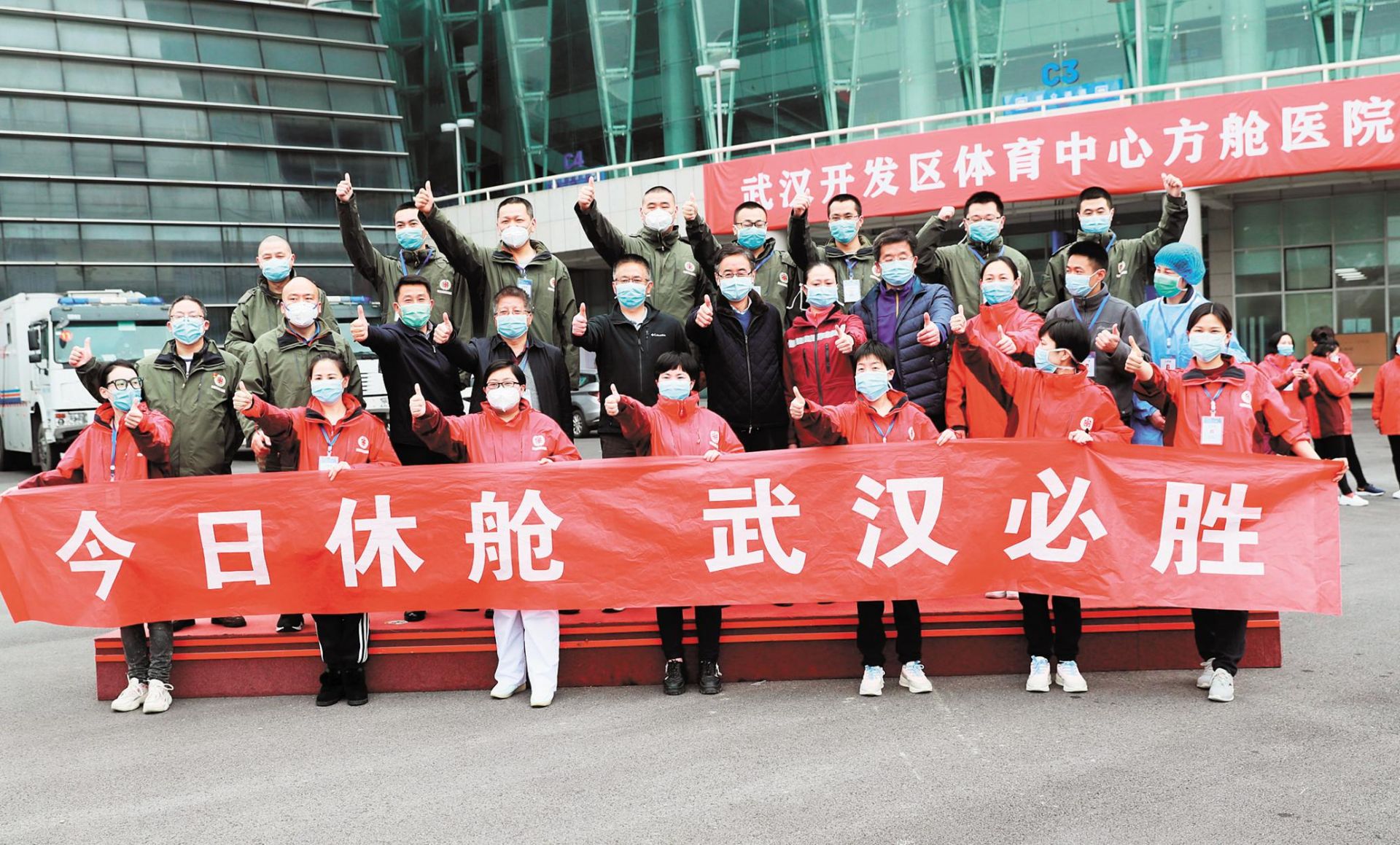 2月5日以来,武汉为实现“应收尽收”目标,建成并投用16家方舱医院。截至3月8日,有11家休舱。图为3月8日,武汉体育中心方舱医院送走最后13名患者后,医护与后勤人员合影留念。