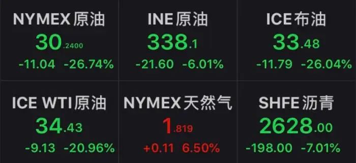 9日,国际石油价格暴跌,一度跌超30%,刷新历史最大单日盘中跌幅。NYMEX原油期货收跌26.74%,报30.24美元/桶,创2016年2月以来新低;布伦特原油期货跌26.24%报33.39美元/桶,双双创1991年海湾战争以来最大单日跌幅。