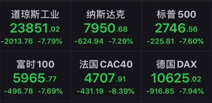 据Wind资讯统计的16个全球股市重要指数中,9日,除了美国三大指数,英国富时100、德国DAX、法国CAC40、日经225、澳洲标普200等,共9个指数盘中跌幅,甚至当天收盘跌幅超6%。欧洲三大股指更是盘中跌逾8%,跌幅靠后的为中国上证指数,跌约3%。