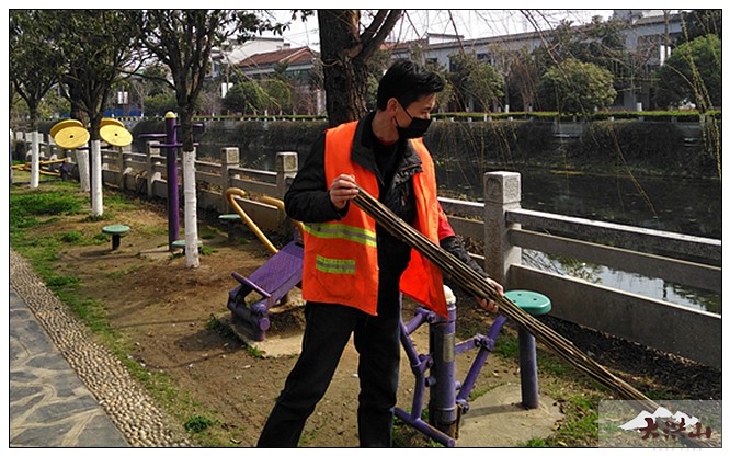 他每日带领着15名环卫工人一齐上阵,严格执行环卫清扫保洁及路面清洗制度,认真落实农贸市场、公厕、垃圾中转站及环卫设施设备的消毒制度,坚决守护大洪山的干净、卫生和整洁。每天除了完成日常的清扫保洁、河道清理任务外,还特地加大街道、道路洒水洗城频次,及时组织垃圾外运终端处置,每天对户外座椅、健身器材等设施及中转站、市场、公厕、垃圾桶以及各类环卫设施设备及车辆进行一天两遍消毒杀菌,消毒区域不留死角,不留隐患,确保有效阻断病毒传播链。在他统筹安排下,长岗镇区清扫保洁、垃圾压缩收运、废弃口罩收集、公用设施消杀、河道清理、垃圾外运……都有条不紊的正常运行,确保了大洪山城乡生活垃圾日产日清处置到位,废弃口罩收集处置到位,环卫及公用设施消毒到位,为全面打赢这场疫情防控阻击战默默奉献力量。