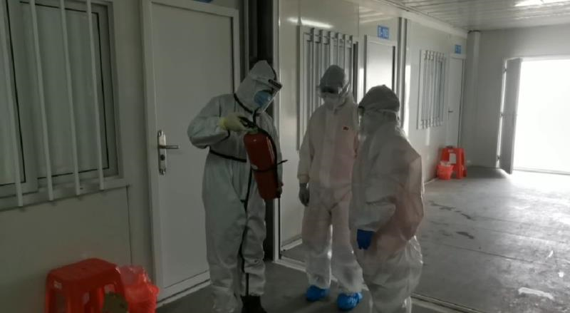 “不要遗漏任何一个角落,不要放过任何一个病毒”,说完,消防员李坤城开始带领队员们分别深入健康中心院内开展消杀任务。他们每天上午下午定时对院内几栋楼和生活区进行消杀。队员们身上背负的简易喷雾器载液重达30多公斤,每次消杀任务要连续作业3、4个小时,覆盖面积1万多平方米,中途不能上厕所、喝水,加上防护服密不透风,队员们出来后衣服都湿透了。目前,已累计消杀8万多平方米。由于每天长时间作业,即使穿着防护服,但难免触碰到消毒液,对衣服和皮肤都有一定的影响,而所有队员的精神依旧昂扬。
