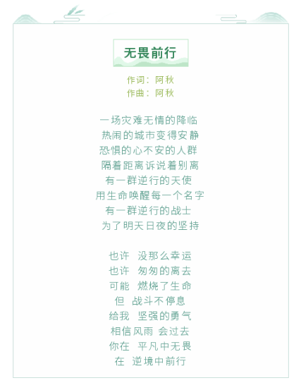 作者介绍:阿秋,随州曾都区人,疫情期间因母亲是医护人员,妻子是公安干警都第一时间参与到抗疫情的战斗中,这种舍小家顾大家逆行精神深深感动了他,阿秋自弹自唱创作了这首《无畏前行》向奋战在抗疫一线的天使、战士致敬!