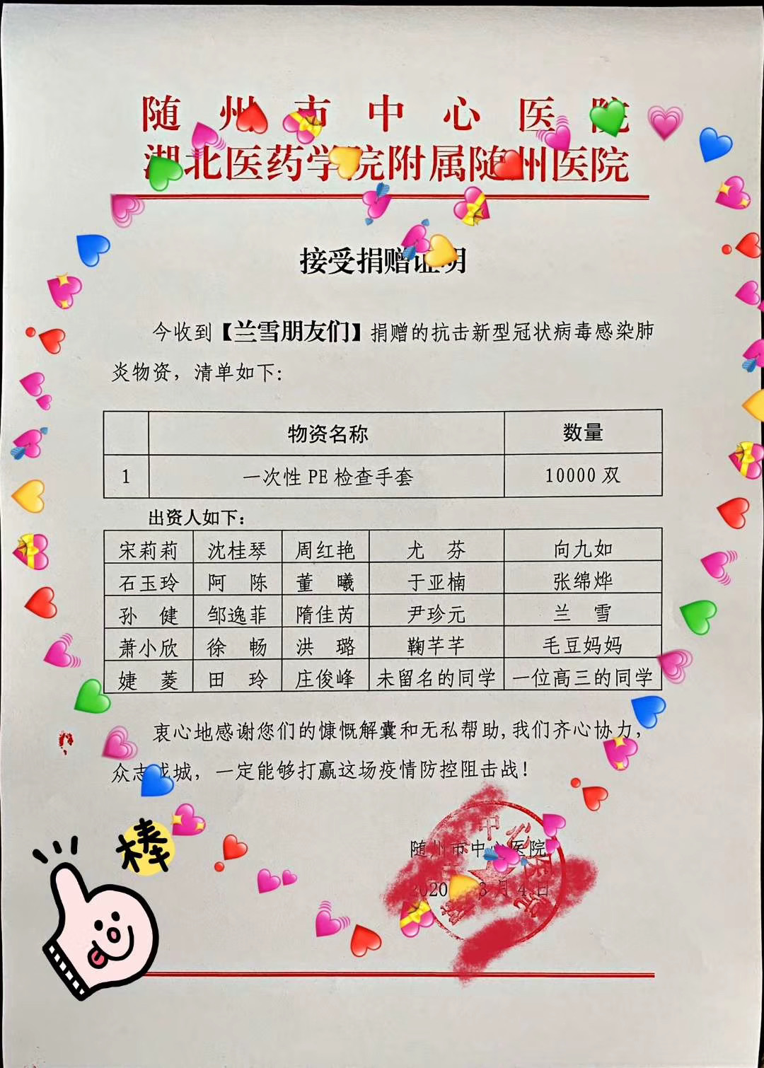 北京大学随州籍研究生兰雪,疫情期间,看到家乡人民因防控物资极度短缺而举步维艰的抗疫现状,感到十分心疼和担忧。1月28日开始,在个人微信朋友圈中组织捐款以采购物资,寻找大额出资方认捐物资。截至目前,收到其老师、同学、亲人和朋友的爱心捐款共68,152.8元。自2月7号开始,将每一笔物资的捐赠在微信朋友圈进行实时汇报。