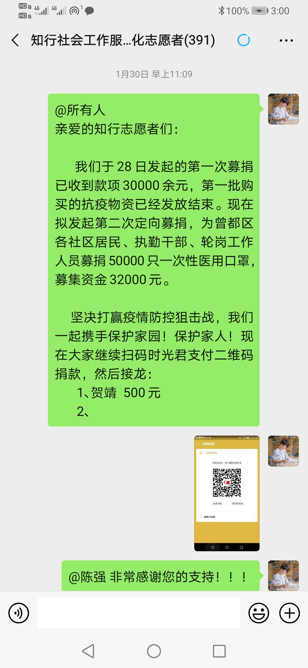 知行公益微信群由贺靖组织发起,原本有70多名成员,建立的初衷是关爱我市的留守儿童。新冠肺炎疫情发生后,大家将目光转向爱心抗疫,成员发展至700人。40天的时间700名志愿者投身‘“知行公益”团队,他们分散在全市不同市区县、小区、乡镇、村组,主动承担志愿工作,哪里需要哪里搬!截至目前,知行公益团队共发起“曾都,加油’、”随县,加油“等7次定向募款活动,共筹资22.6万余元,在国内和全球采购物资共计:一次性医用口罩123000个,N95口罩1560个,面罩1728盒,护目镜1020个,防护服143件。