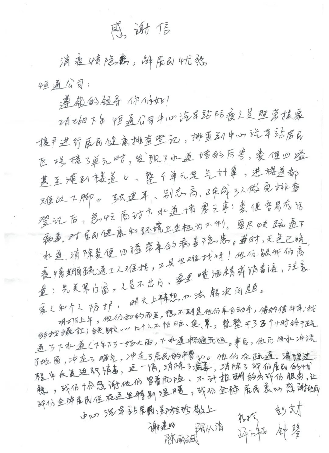 “他们用水冲洗地面,这一冲,冲走了晦气,冲走了居民的糟心;他们还在疏通、清洗过程中反复进行消毒,这一消,消除了病毒,消除了我们居民的忧愁”。这是2月28日,居民郑女士在对捷龙恒通公司联名感谢信中说的一段话。