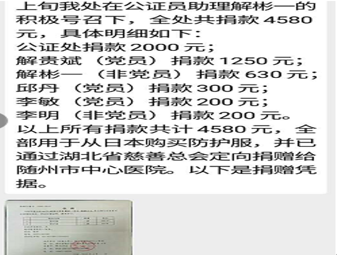 “我有,我捐,我全力支持”多么干脆的声音。曾都区公证处解贵斌直接答复并带头在2月8日积极组织捐款4千余元。机关离退休干部储本柱接到通知后勇先捐款500元。这次区司法行政系统党员干部职工共捐款近1.5万元。