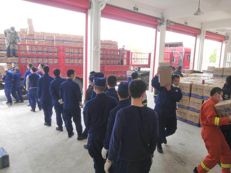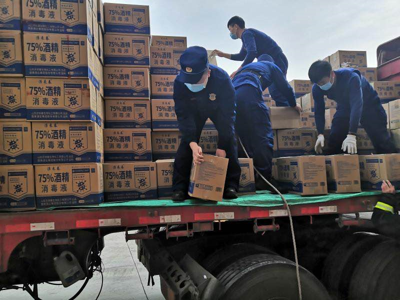 3月11日,随州市消防救援支队东城特勤站接到支队指挥中心调派,前往曾都区防疫物资存放点,将60吨75%浓度的酒精搬进仓库。