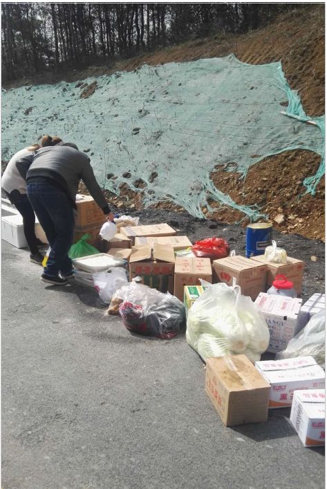 10:40,白巍和后勤人员前往大门接收配送的生活物资,并现场对物资严格消毒处理。