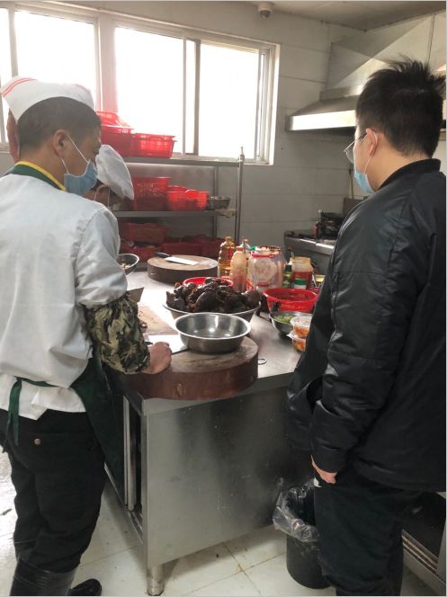 9:50,张竞峰到食堂监督工作人员做好卫生消毒、佩戴口罩等安全防护措施。据悉,为确保食品卫生安全,专案组每天3次到食堂进行监督和抽查。