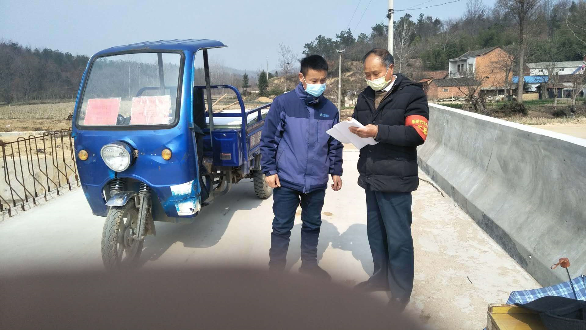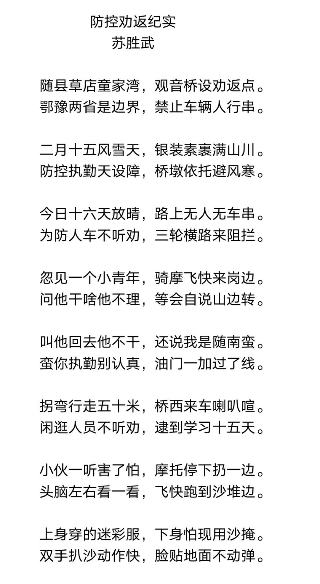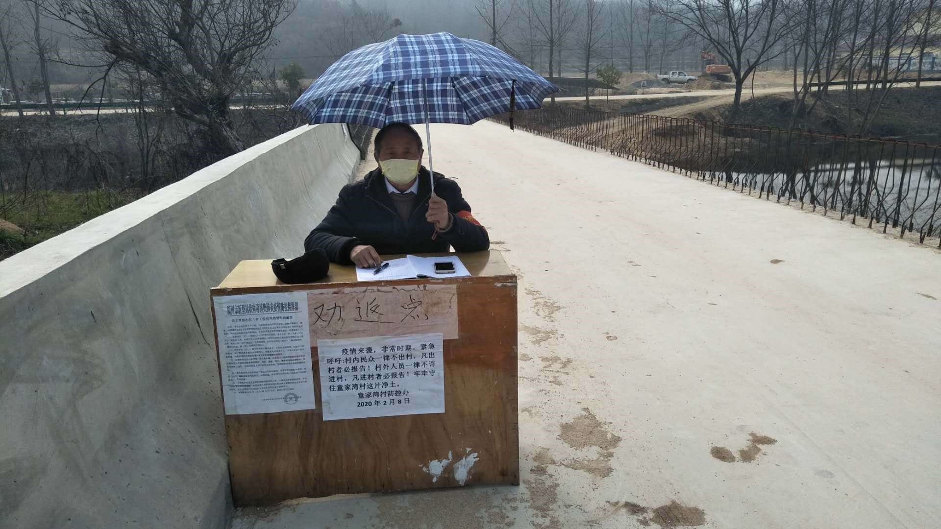 1月29日正月初五,苏胜武乘车到随县草店镇童家村475公路观音寺大桥劝返点站岗执勤。这个检测点与河南省信阳市交界,距驻村委会有两公里之余。苏胜武一天来回步行四趟,早晨8点到岗,下午5点下岗。除了一天四趟回村委会做饭吃饭,苏胜武其余时间都坚守在岗位上,搭建工棚、劝阻行人、跑腿传事等等。