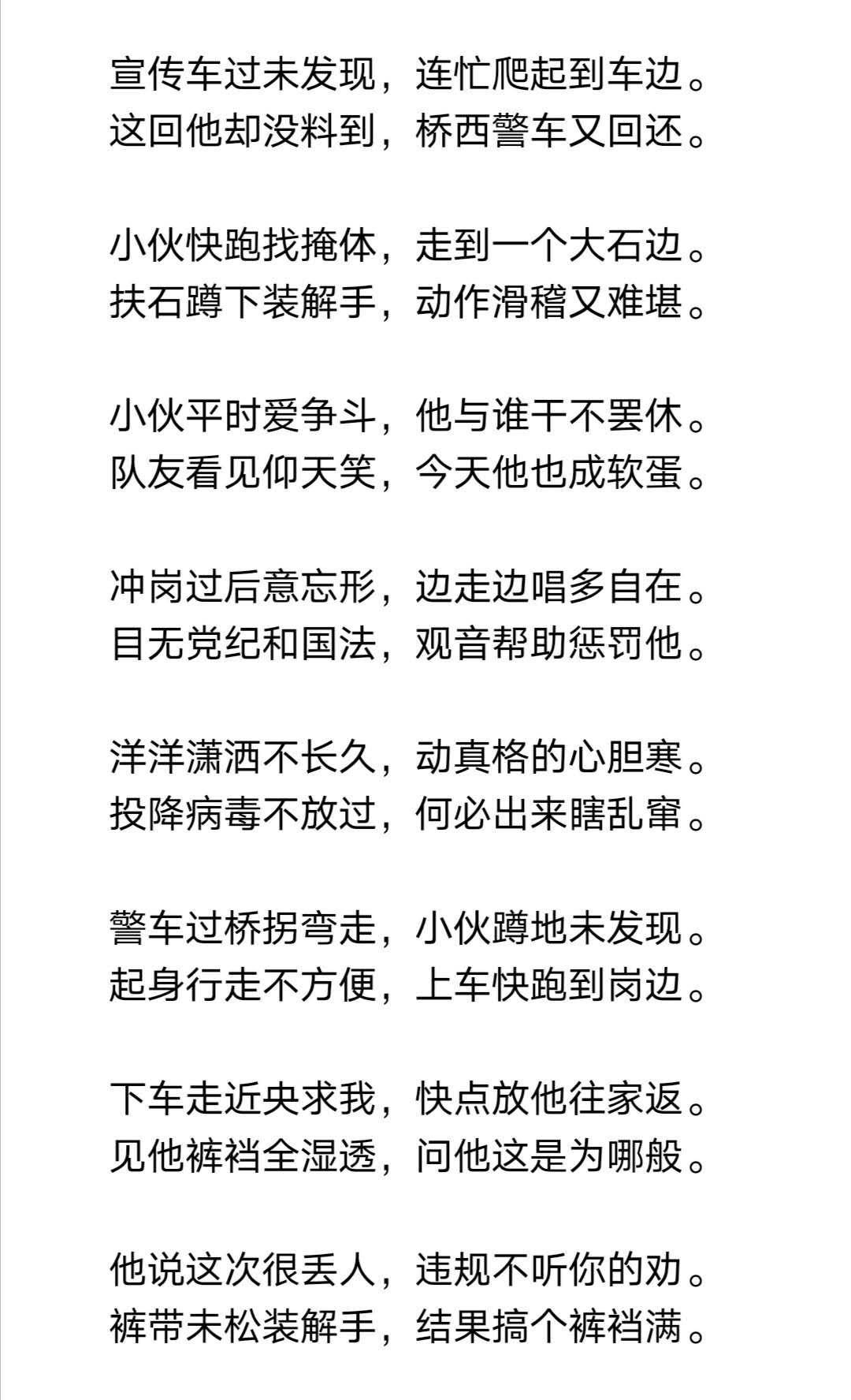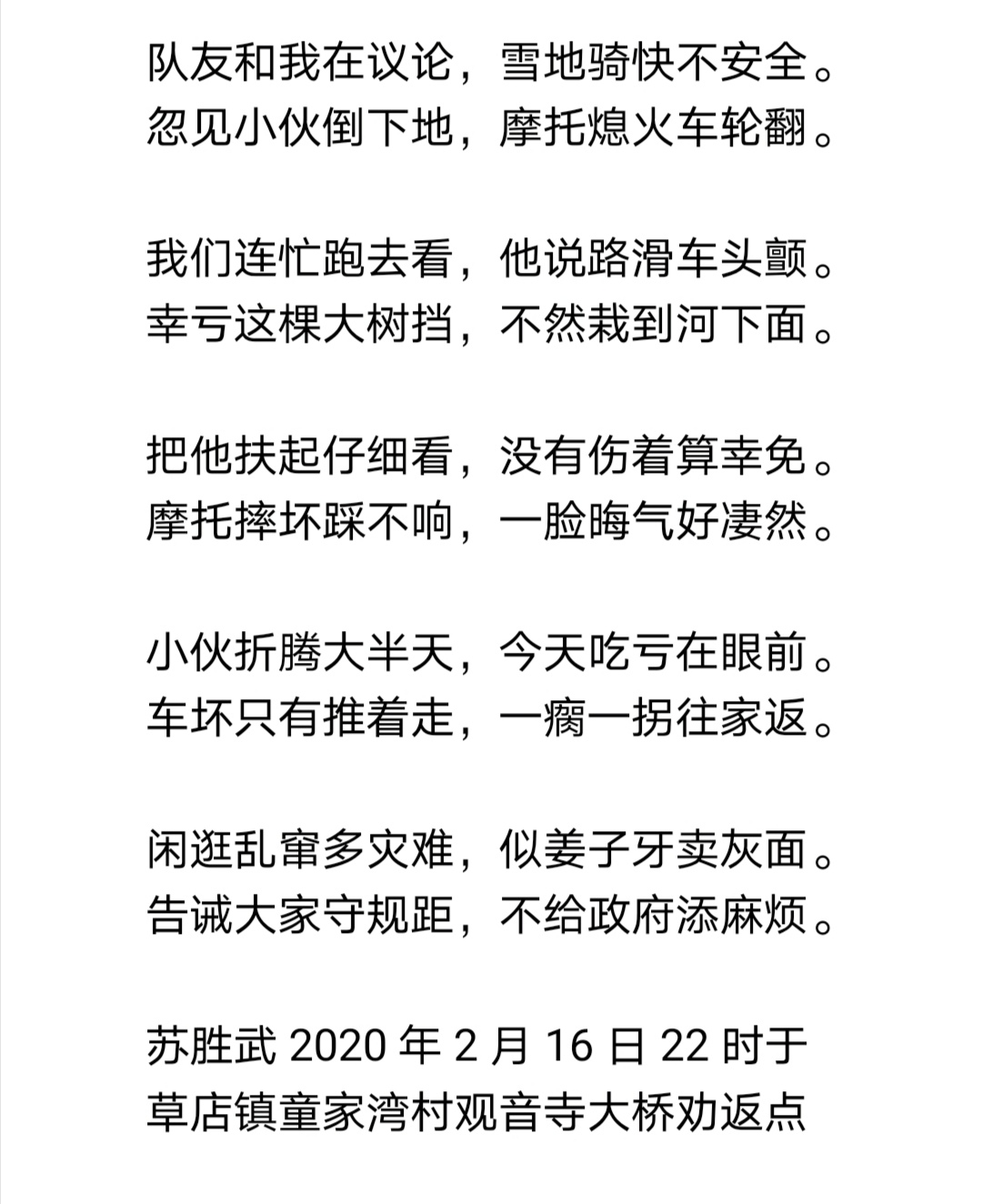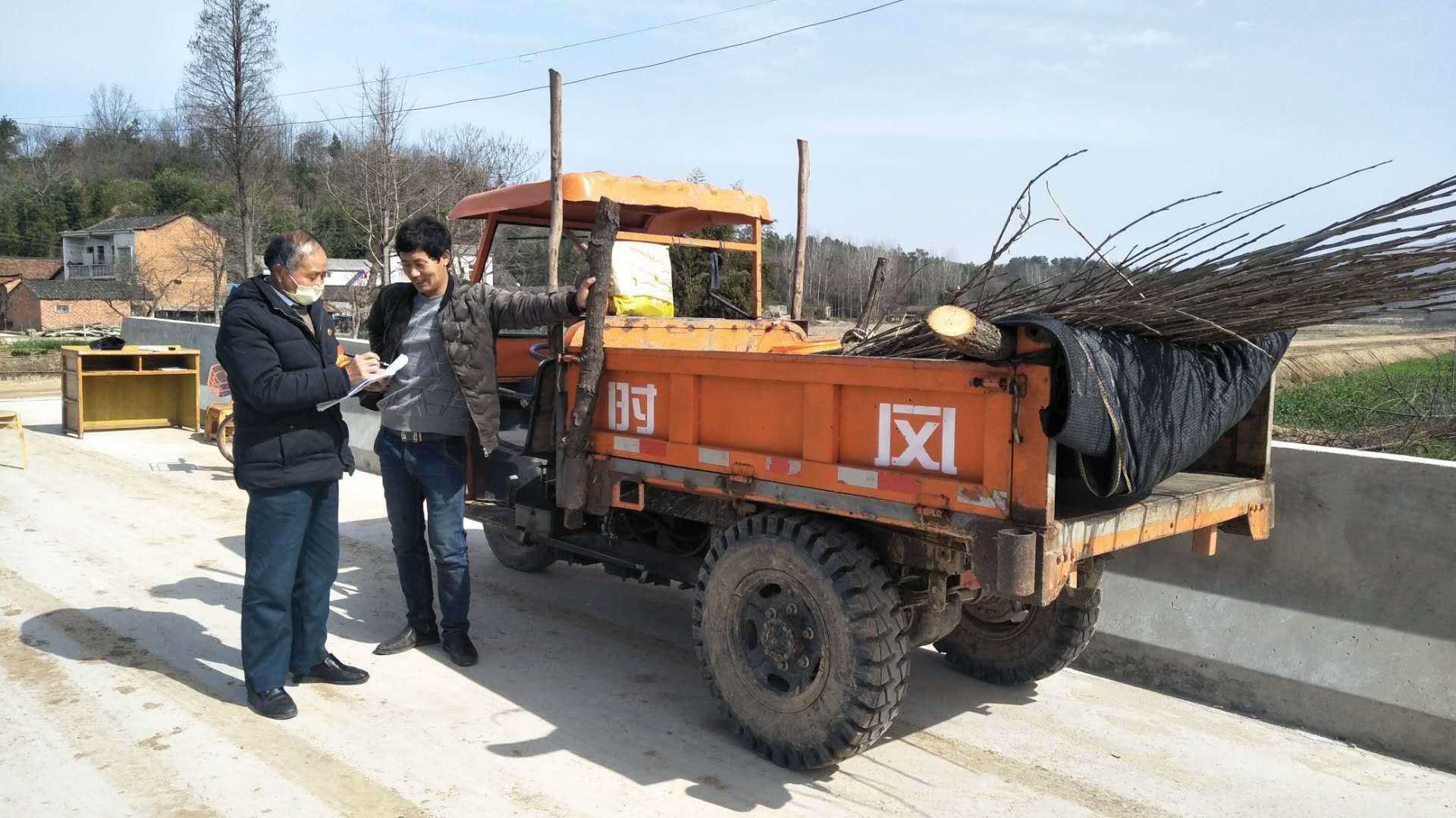 1月29日正月初五,苏胜武乘车到随县草店镇童家村475公路观音寺大桥劝返点站岗执勤。这个检测点与河南省信阳市交界,距驻村委会有两公里之余。苏胜武一天来回步行四趟,早晨8点到岗,下午5点下岗。除了一天四趟回村委会做饭吃饭,苏胜武其余时间都坚守在岗位上,搭建工棚、劝阻行人、跑腿传事等等。
