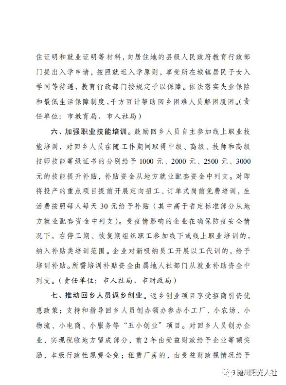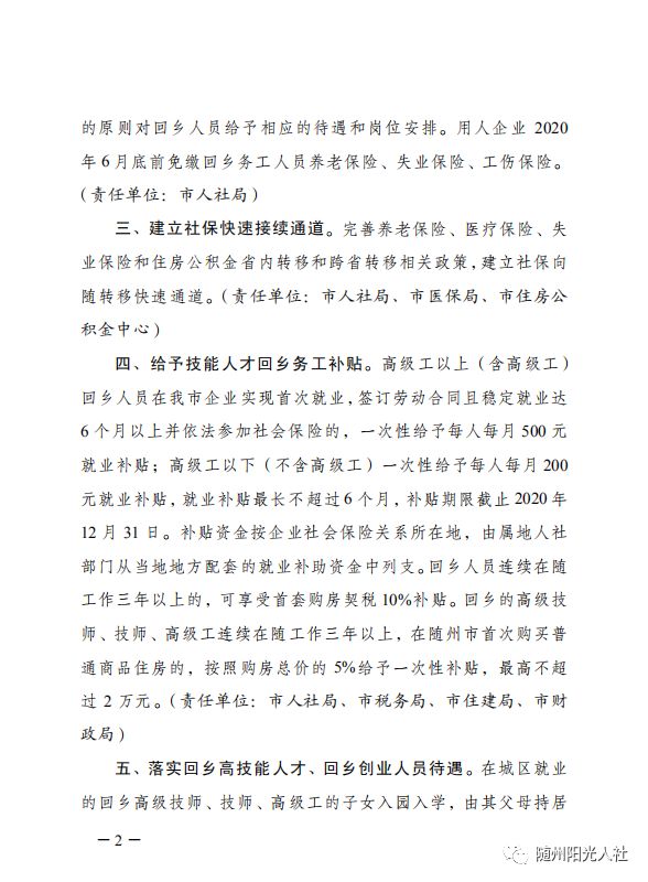 同时,市委市政府高度重视回乡人员服务保障工作,近期专门出台了《关于激励回乡人员就业创业工作措施的通知》,提出的“十条举措”含金量高,条条都是干货。《通知》中明确提出,全市人社部门将力争为回乡人员提供2万个以上的就业岗位,建立社保向随转移快速通道,给予回乡务工的技能人才每月500元以内最高不超过6个月的就业补贴,对回乡人员在随工作期间取得技能证书的给予最高不超过3000元的技能提升补贴,对回乡人员在随创业符合条件的给予1万元创业补贴和15万元以内的担保贴息贷款,等等。财政、税务、招商、住建、医保、教育等部门也提出了系列务实举措,条条真金白银的好政策,将帮助你们在家乡实现就业创业兴业。