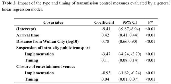 研究得出的结论为:武汉出行禁令和国家紧急响应推迟了疫情增长,最终限制了COVID-19疫情的规模。据估计,武汉的封城将疫情扩散到其他城市的时间推迟了2.91天(95%置信区间:2.54-3.29),从而推迟了中国其他地区的疫情增长。而和启动控制措施较晚的城市相比,提前采取措施的城市在疫情暴发的第一周报告的病例数减少33.3%。在这项调查的干预措施中,最有效的是暂停市内公共交通、关闭娱乐场所和禁止公共集会。