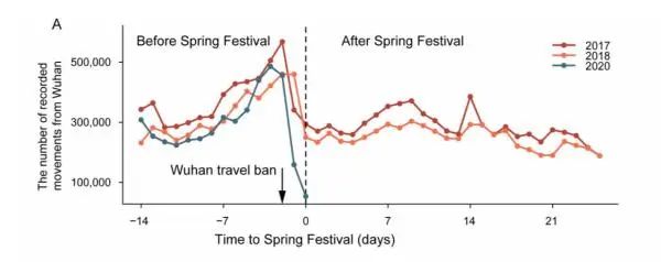 研究团队首先调查了武汉出行禁令的影响,将2020年的出行情况与前几年进行了比较,并探讨了假期出行对中国各地传播感染的影响。