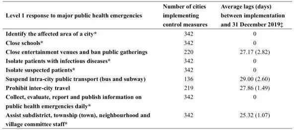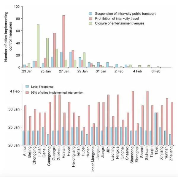 统计得出,所有城市都实施了学校停课、隔离疑似和确诊患者,以及信息公开的措施。有64.3%的城市禁止公共集会和关闭娱乐场所。136个城市(39.7%)暂停市内公共交通,219个城市(64.0%)禁止城际出行。