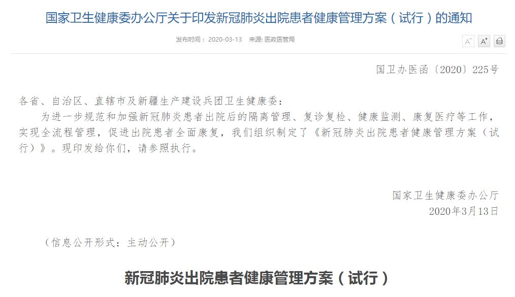 14日,据国家卫健委网站消息,为进一步规范和加强新冠肺炎患者出院后的隔离管理、复诊复检、健康监测、康复医疗等工作,实现全流程管理,促进出院患者全面康复,国家卫生健康委办公厅组织制定了《新冠肺炎出院患者健康管理方案(试行)》。以下为管理方案全文: