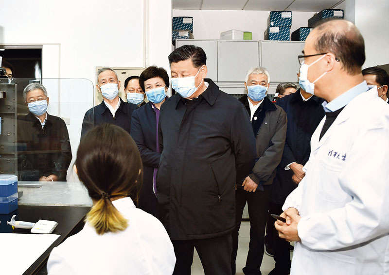 2020年3月2日,中共中央总书记、国家主席、中央军委主席习近平在北京考察新冠肺炎防控科研攻关工作。这是习近平在军事医学研究院重大疫情应急防控药物研究室了解疫苗和抗体研制情况。 新华社记者 丁海涛/摄