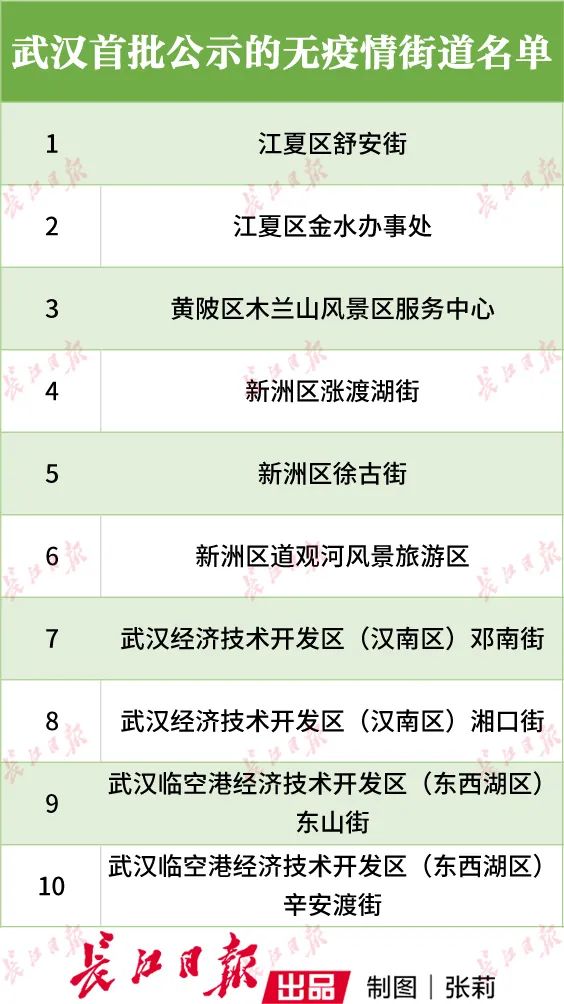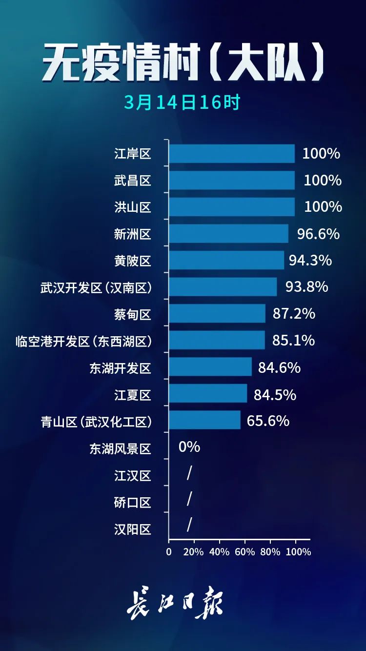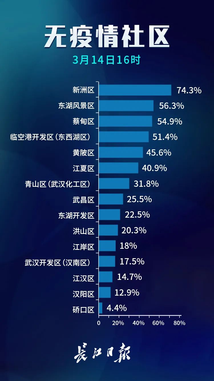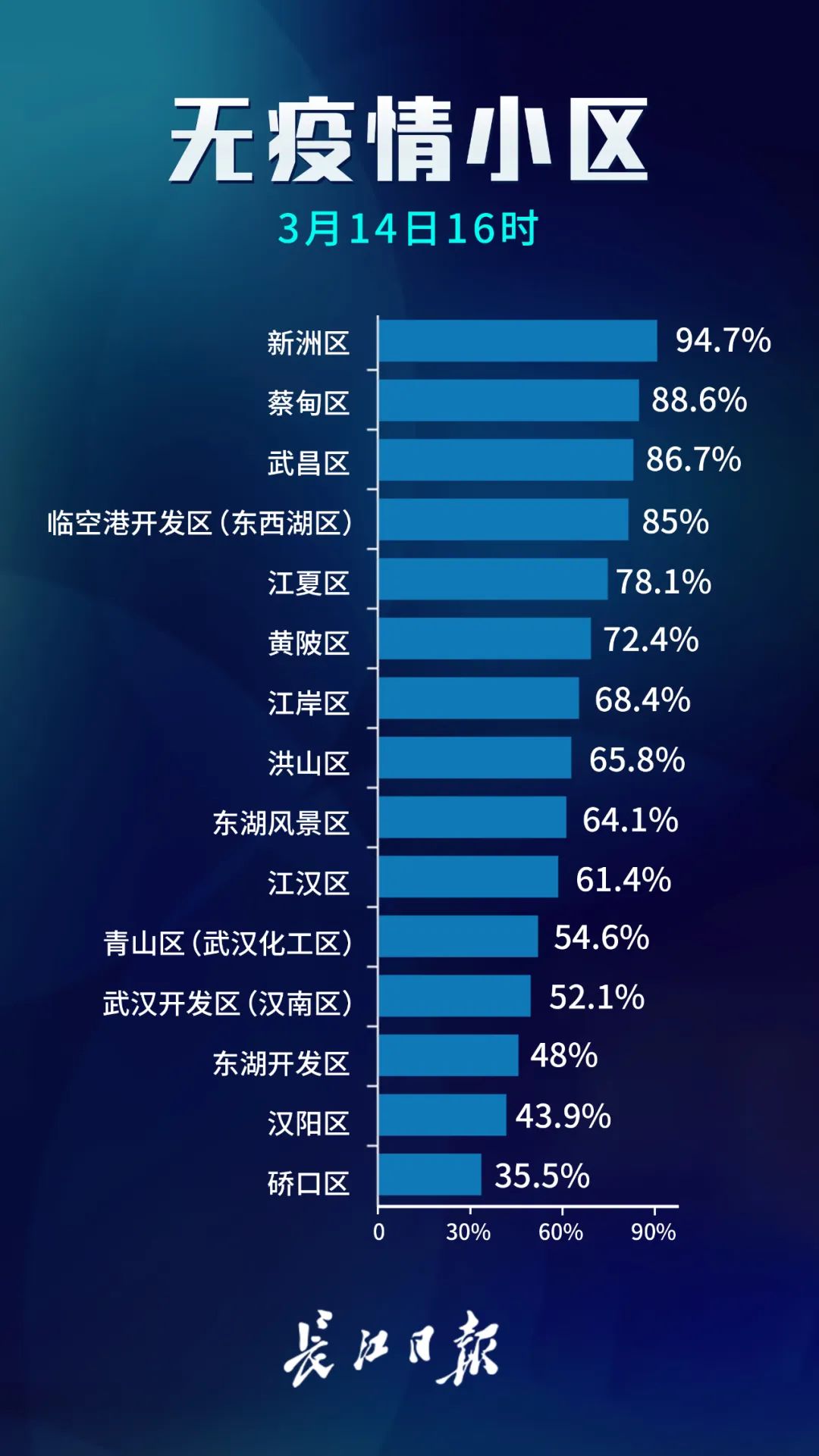 3月14日,湖北省武汉市新冠肺炎疫情防控指挥部社区疫情防控组公布全市第四次评定的无疫情小区、社区、村(大队)名单。也首次公布了十个无疫情街道名单。