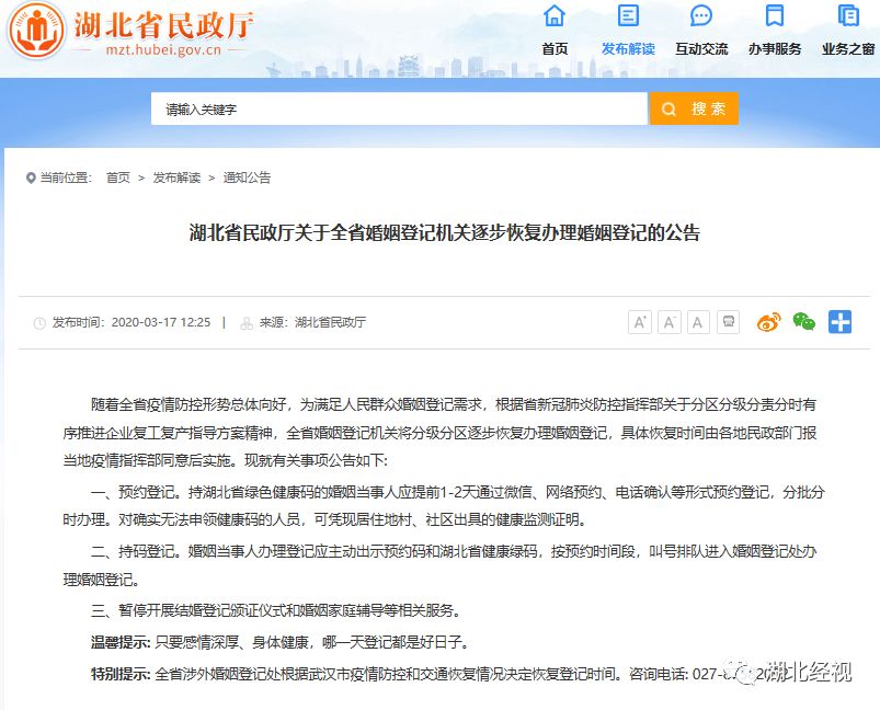 3月17日,湖北省民政厅发布公告称,根据省新冠肺炎防控指挥部关于分区分级分责分时有序推进企业复工复产指导方案精神,全省婚姻登记机关将分级分区逐步恢复办理婚姻登记。