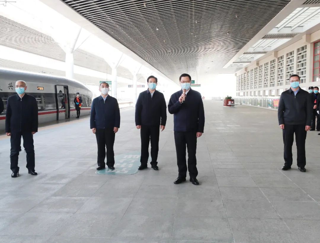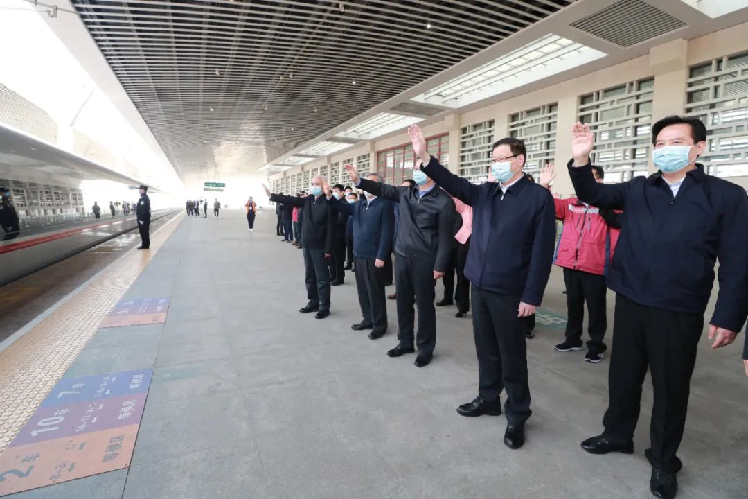 湖北省委书记应勇、广东省人大常委会副主任吕业升来到荆州站站台上看望慰问赴粤返岗务工人员,并为大家送行。