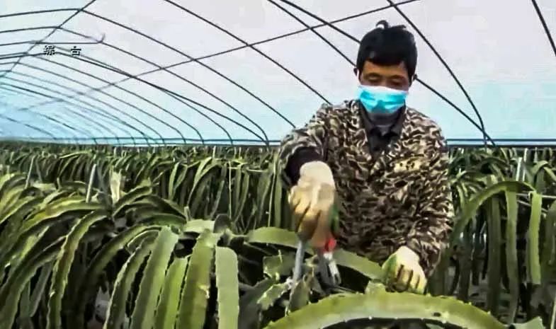 “疫情期间我们隔两天修剪一次,一个人站一个棚,不能聚到一起劳动。”在火龙果大棚,脱贫户苏光军正在修剪枝条,以前每天三人一棚修剪的工作状态根据防疫工作需要也进行了调整,做到防疫备耕两不误。