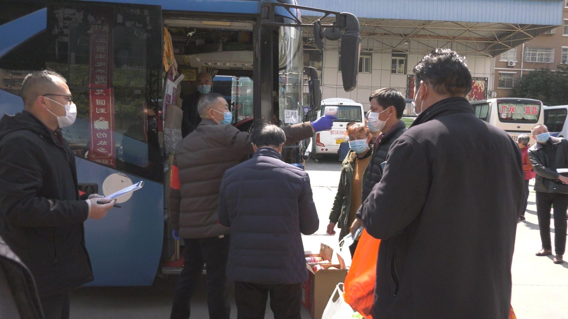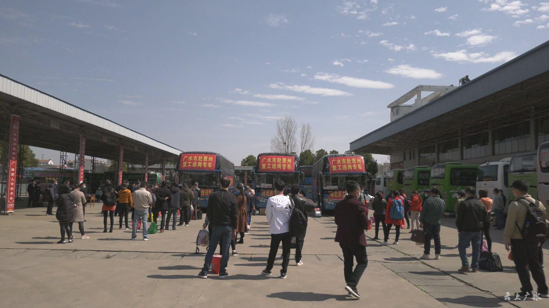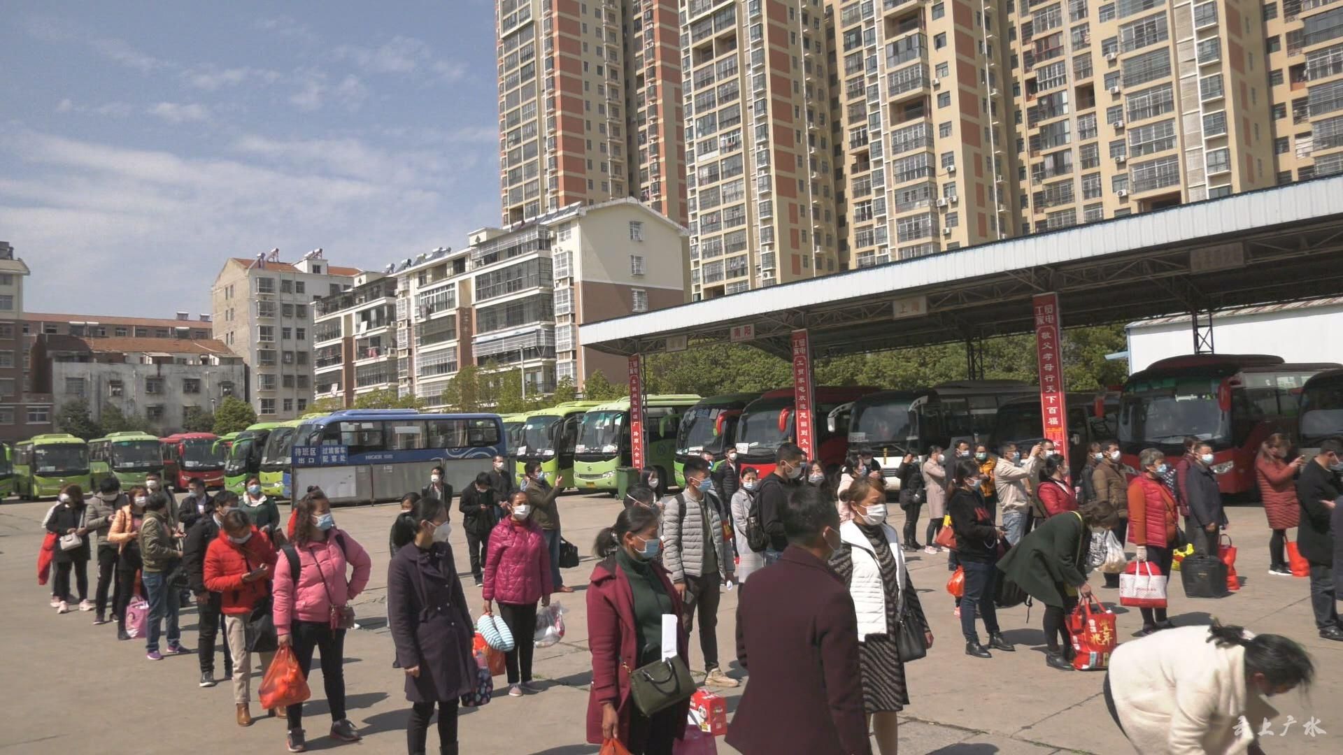 3月17日,广水市首批外出务工人员登上直达广东省惠州市的汽车,这是广水第一批“点对点一站式”,有序组织因疫情滞留在广水的外出务工人员返岗复工。