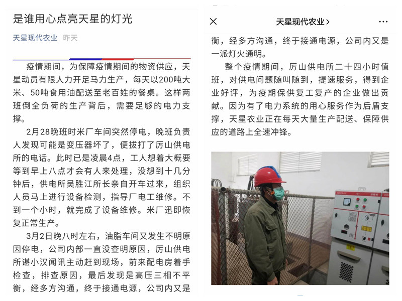 微信号里讲到天星现代农业公司米厂车间两次停电后,客服中心营业班工作人员均在第一时间赶到现场,及时处理停电故障,使米厂得以恢复正常生产,对供电公司表示感谢。
