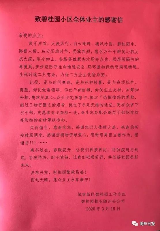 “此‘疫’,是与时间赛跑,是与死神较量,是与命运抗争。得胜,仰仗党委领导,仰仗干部拼搏,仰仗业主支持。风雨偕行,感谢有您……”3月15日,碧桂园小区业主们收到一封来自城南新区碧桂园工作专班联合物业公司致全体居民的感谢信。