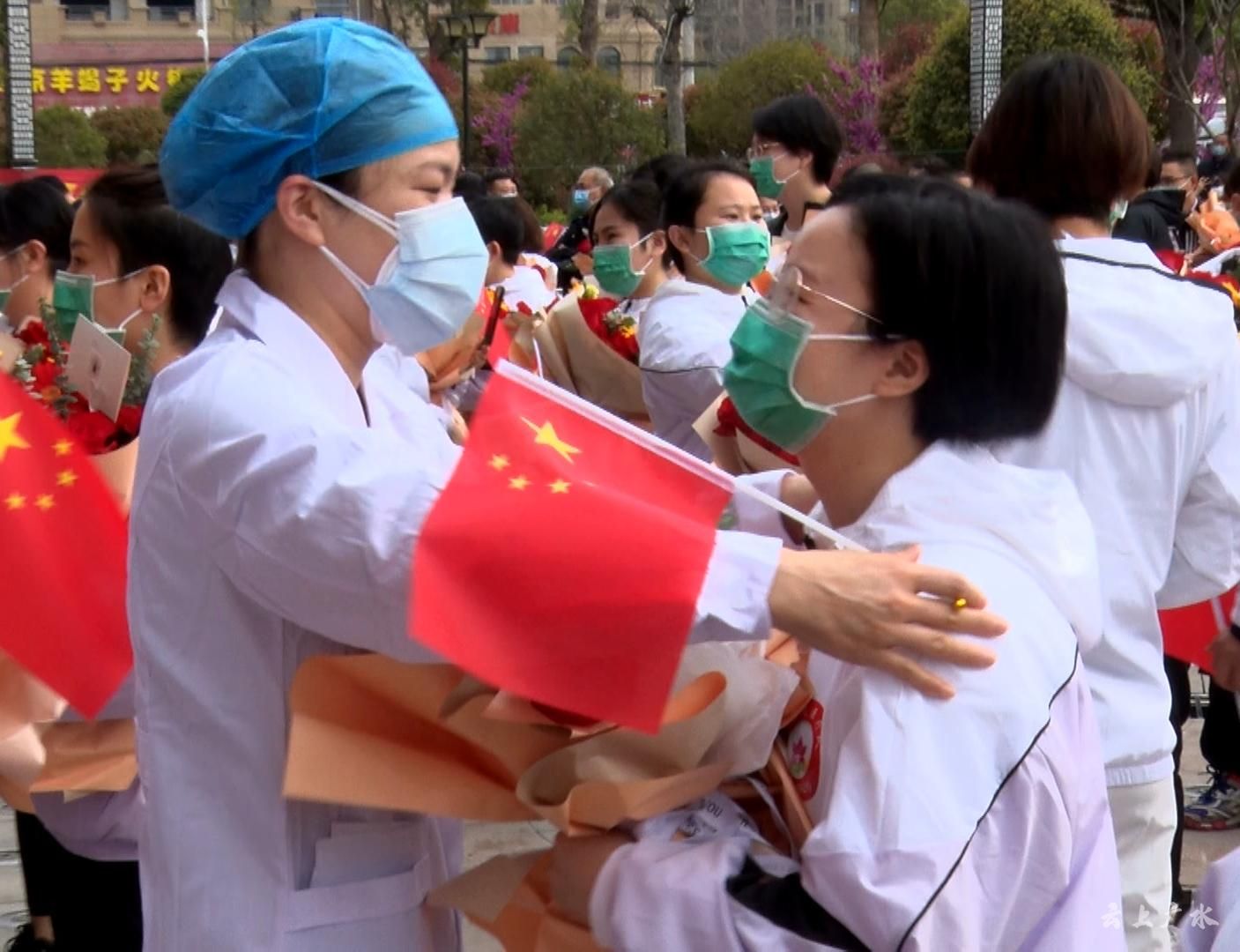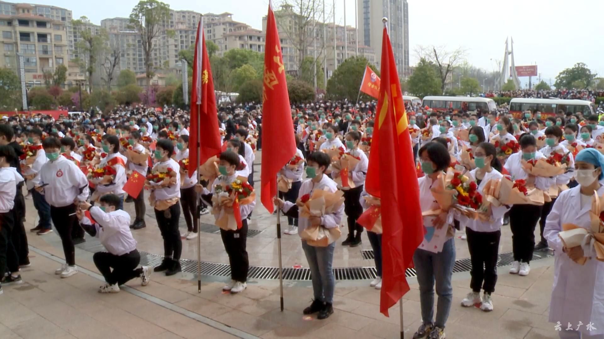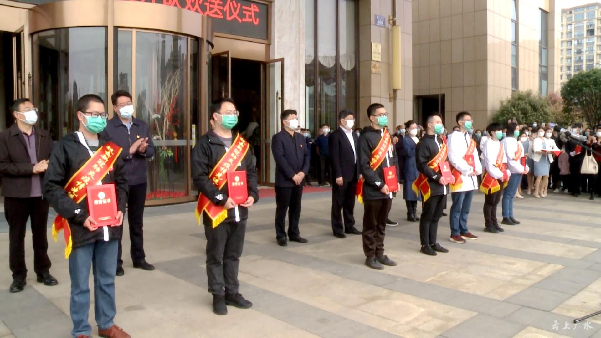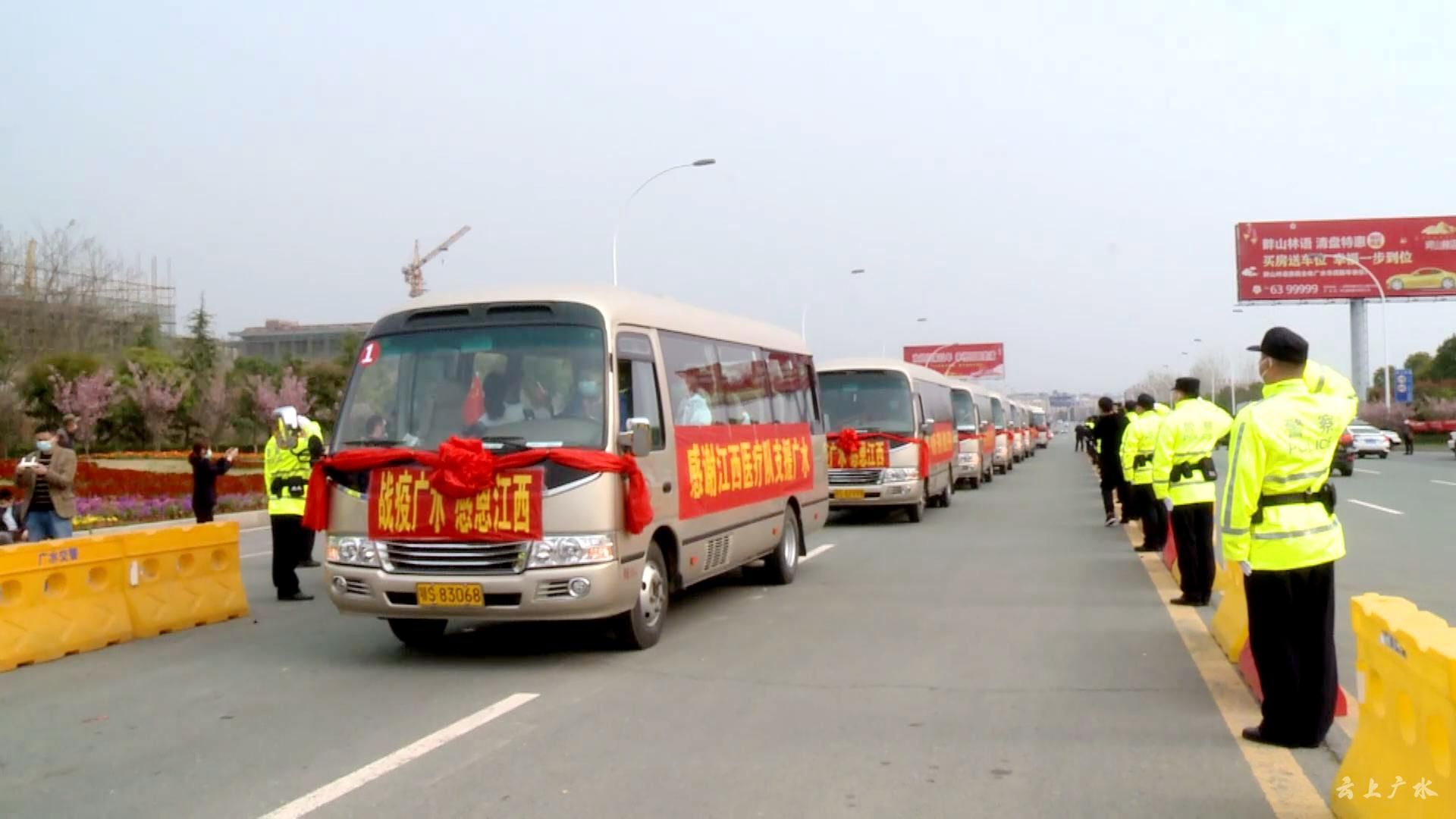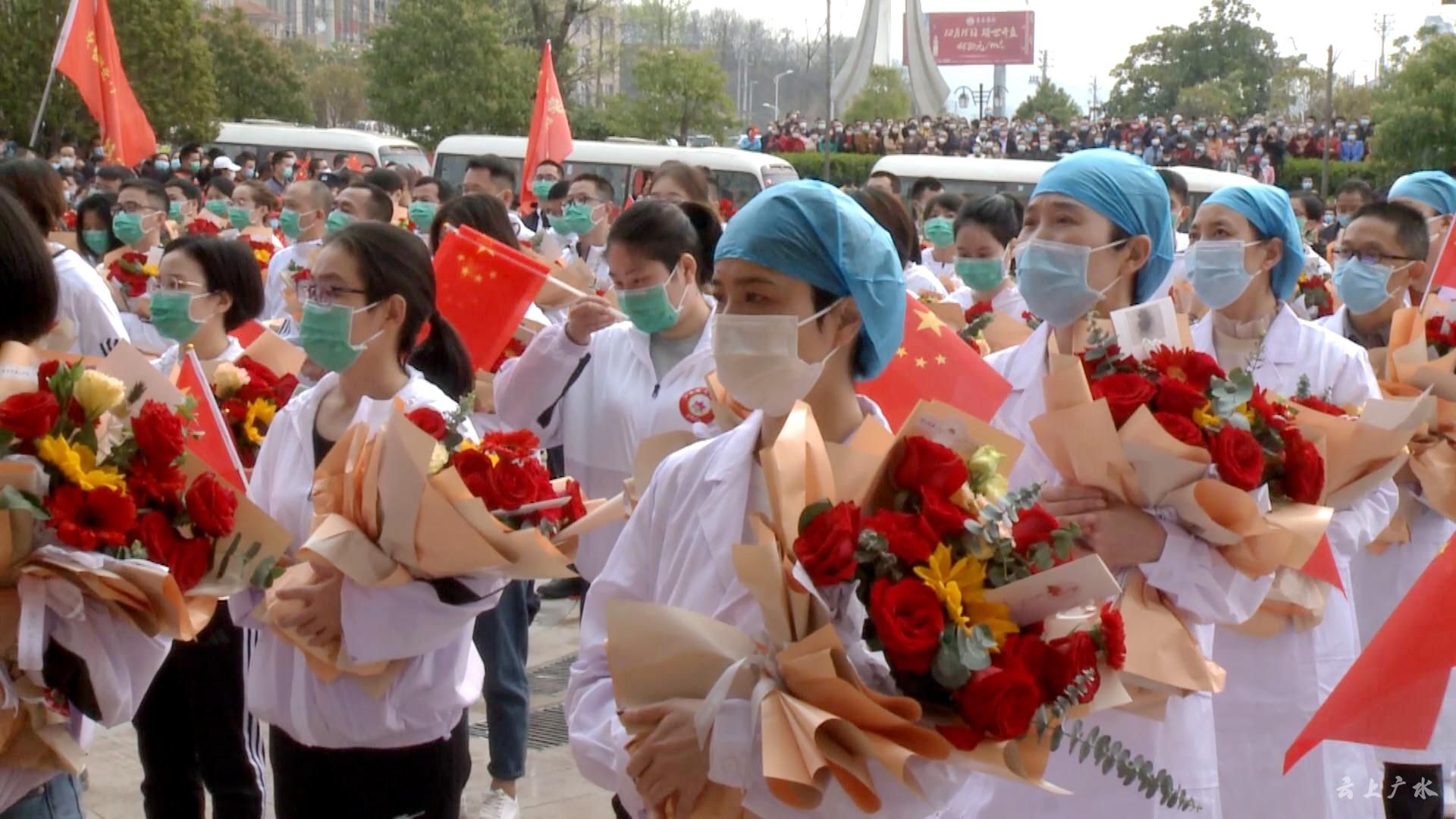 3月23日上午,广水市举行“江西援广医疗队”返程欢送仪式,从医疗队驻地中懋大酒店沿十长线,再到麻竹高速应山出入口,万名市民自发来到医疗队驻地及返程路段,“夹道十里”送别亲人。