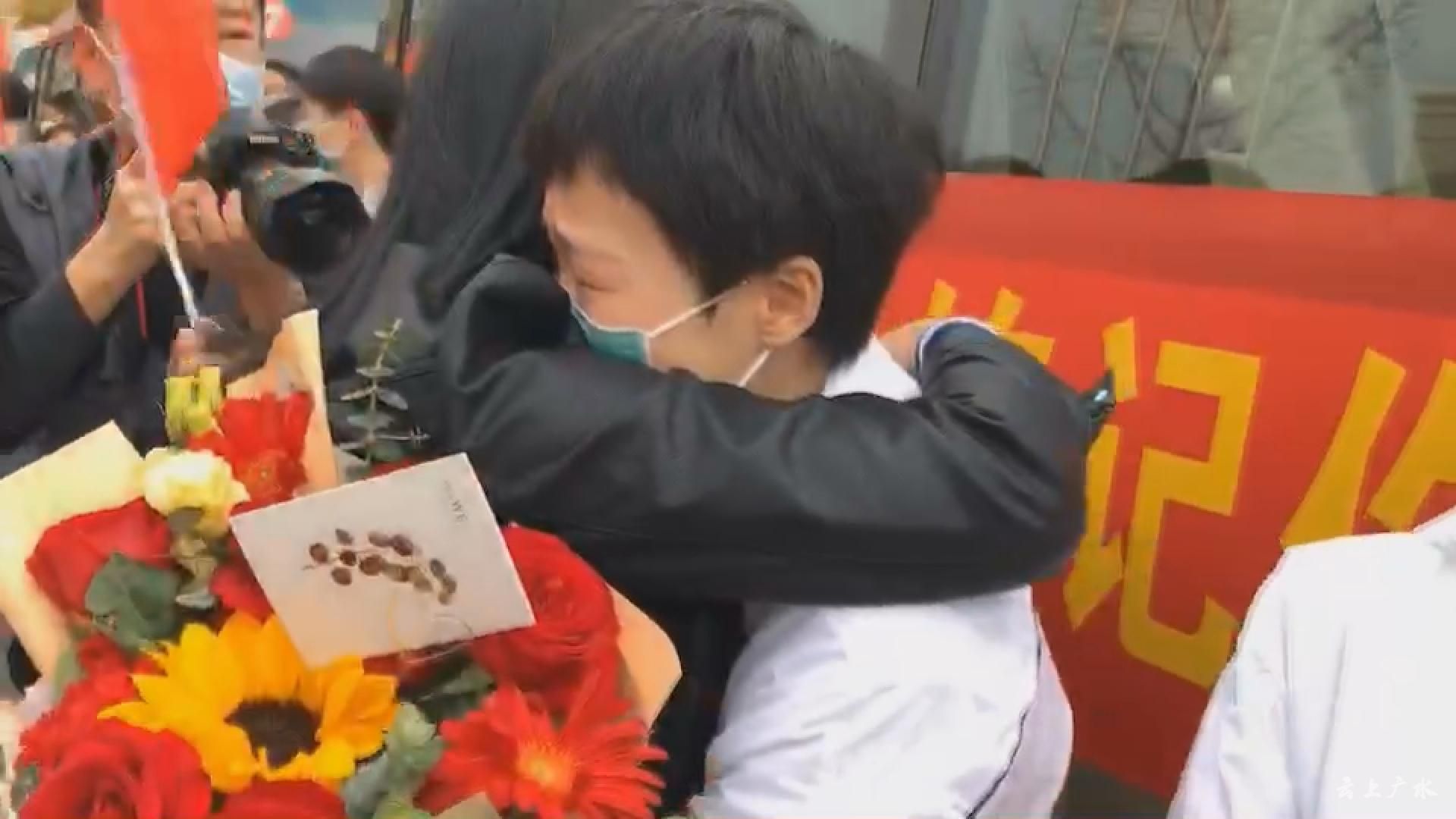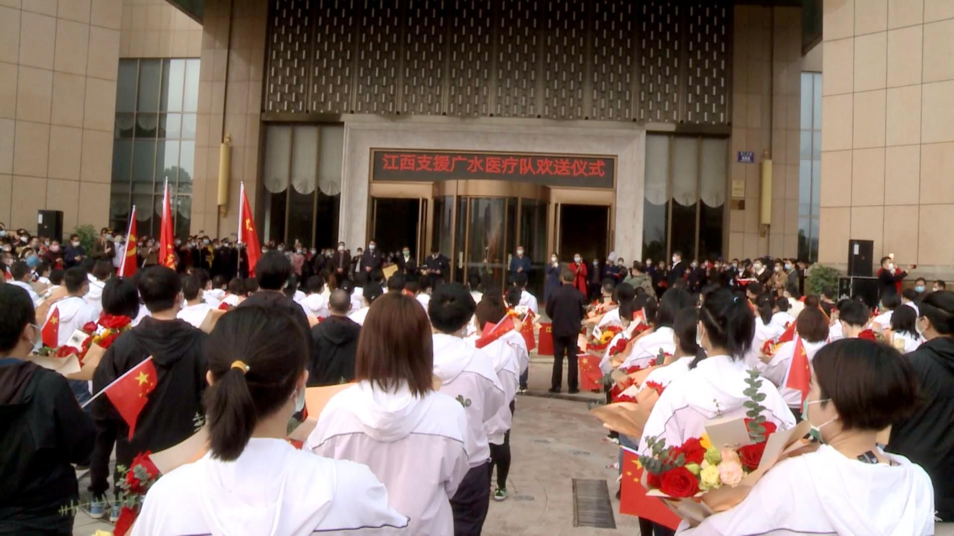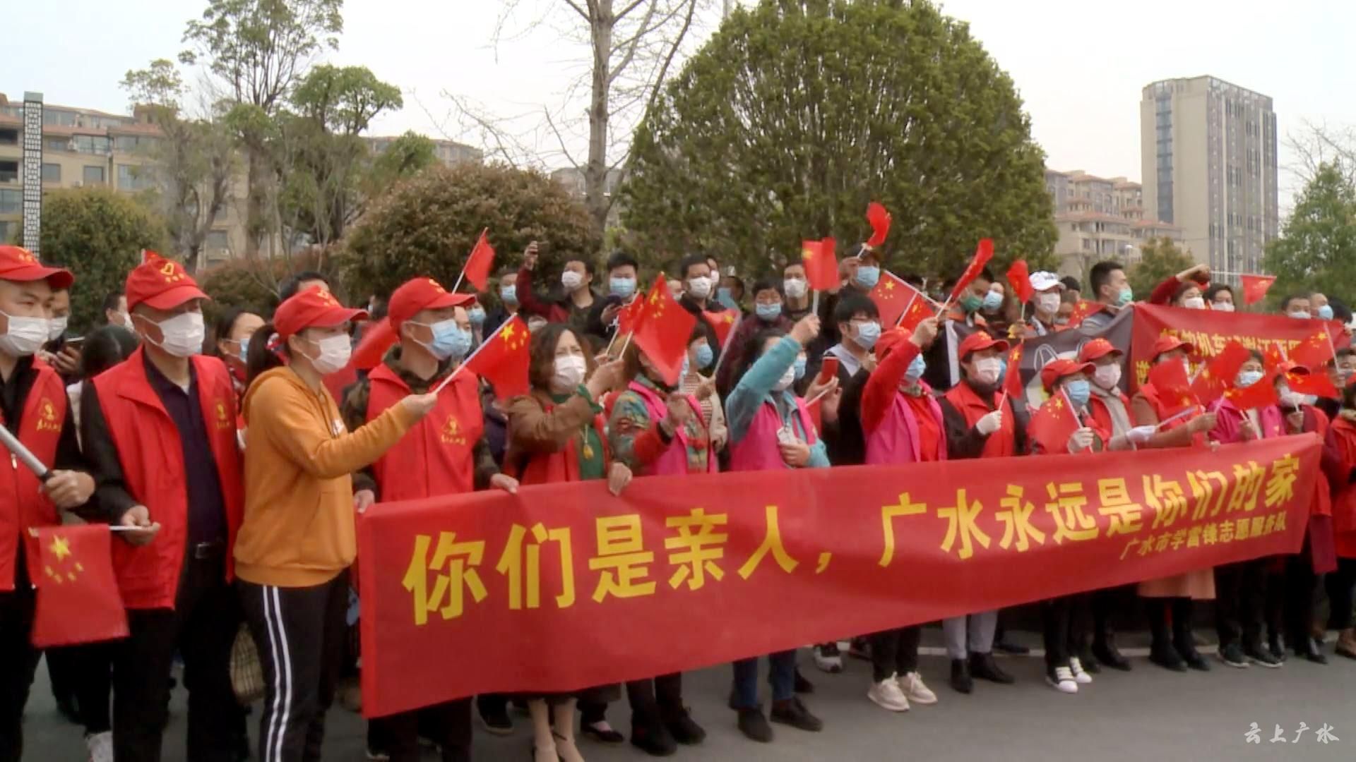 “谢谢你们为我们拼过命!致敬英雄!一路平安!”一声声呼喊、一张张条幅,传递着心声,也写满了广水人民对江西医疗队的感恩之情,自发赶来送别的干部群众整齐列队在两旁,挥舞着国旗,向恩人致敬和送行。