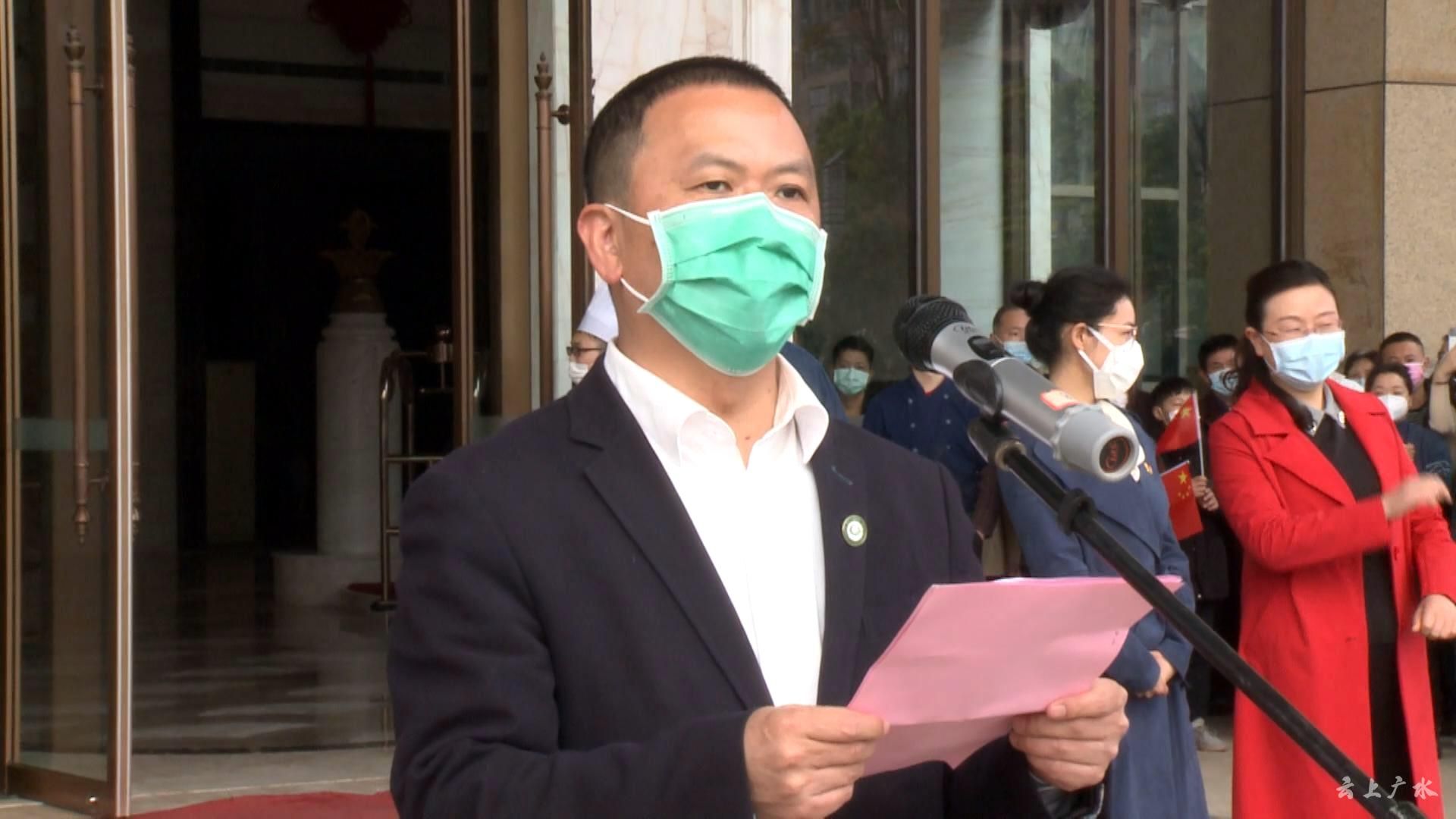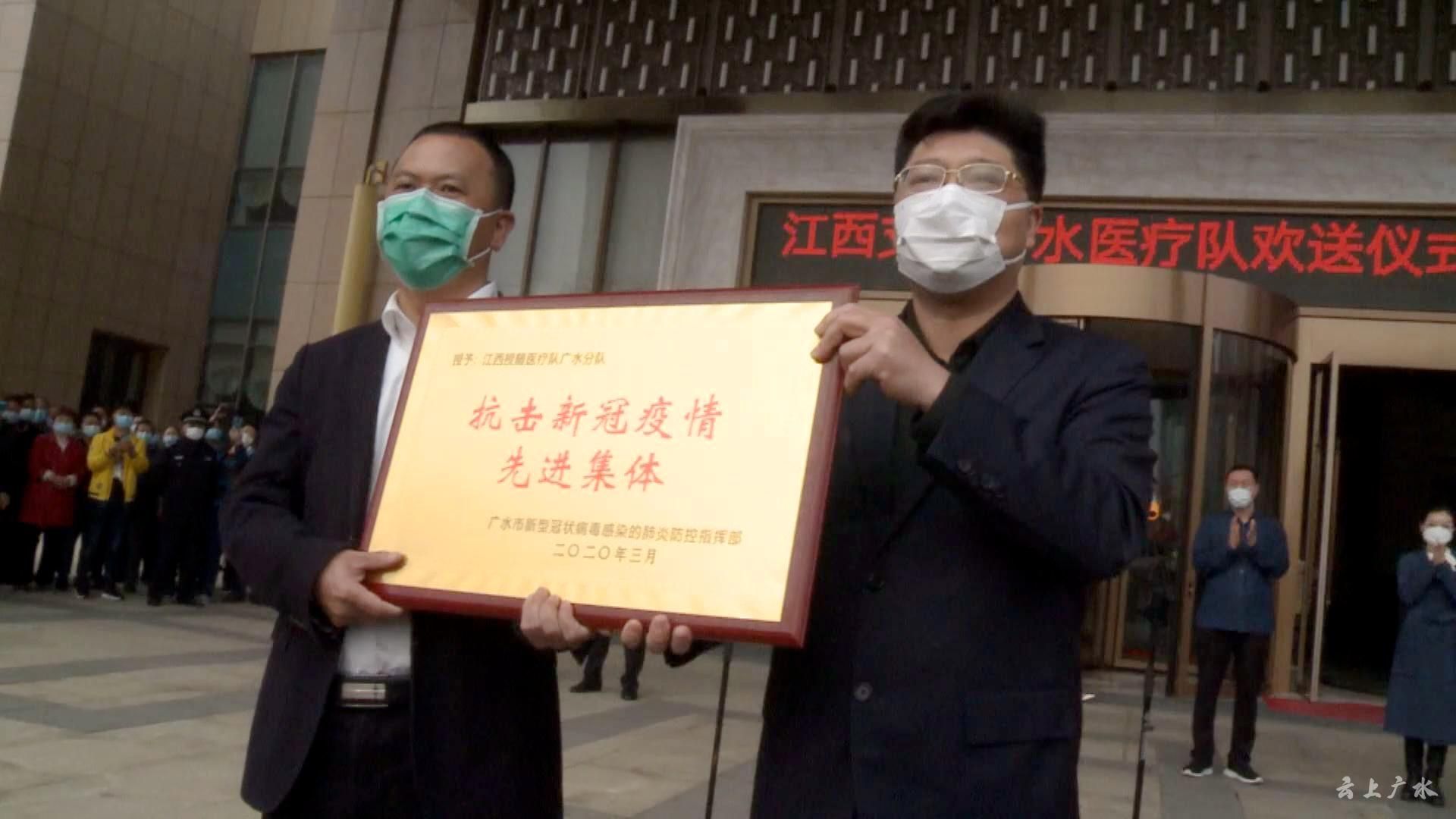 陈懿建代表江西省援随医疗队广水分队125名队员,对广水市委、市政府给予我们的荣誉和鼓励表示诚挚的谢意!陈懿建说,医疗队始终“把人民群众生命安全和身体健康放在第一位”,认真贯彻“坚定信心、同舟共济、科学防治、精准施策”的总要求,实现了“医疗零事故、队员零感染、患者零投诉”的“三零”要求,携手广水医务人员,实现了广水新冠肺炎患者清零。期间,江西医疗队与广水各界干部群众建立了深情厚谊,广水市政府与赣南医学院签订战略合作协议,这是江西与广水战“疫”的结晶,也是赣广友谊的延续。