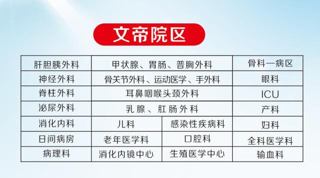 骨科、眼科、耳鼻咽喉头颈外科、口腔科、妇科、产科、生殖医学中心、肝胆胰外科、甲状腺胃肠普胸外科、乳腺肛肠外科、泌尿外科、神经外科、儿科、消化内科、呼吸与危重症医学科、老年医学科、医保便民门诊。