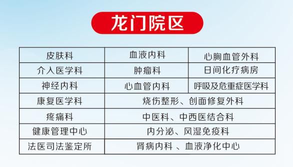 肾病内科、神经内科、心血管内科、消化内科、内分泌风湿免疫科、普通外科、心胸血管外科、骨科、疼痛科、介入科、皮肤科、肿瘤科、呼吸与危重症医学科、中医外科、中医科(中西医结合科)、妇科、生殖医学中心、高血压门诊、医保便民门诊。
